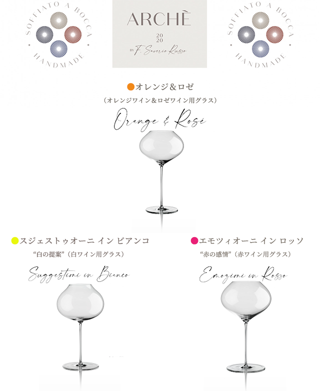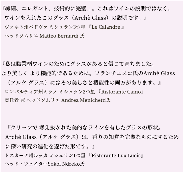 ARCHÈ GLASS(アルケグラス)は、イタリアのミシュランガイド2022 3つ星獲得、そして2022年度版「世界のベストレストラン50*」にて10位にランクインした『Le Calandre(レカランドレ)』をはじめ、多くの星付きリストランテから高い評価を受けています。