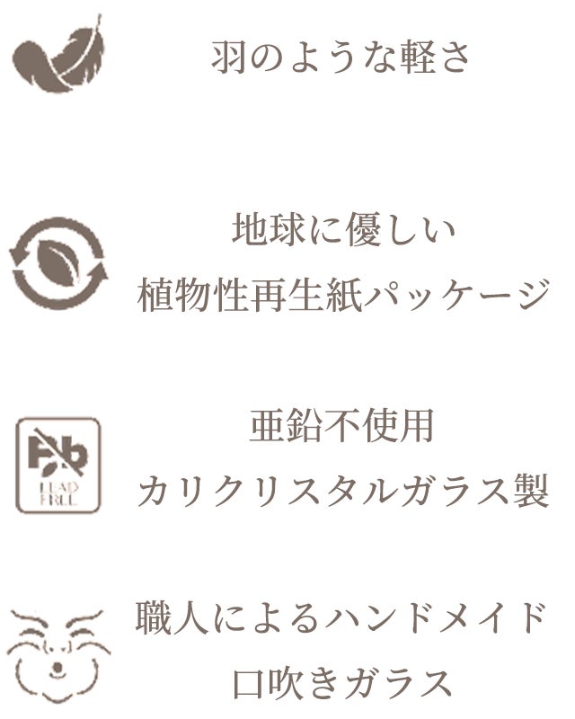 本商品は、「ワインの専門家による“対流現象”の研究を取り入れた洗練かつ機能的なデザイン」、「13世紀から伝わる伝統的なハンドメイドガラス加工技術」、そして「イタリアグラスウェア業界のリーディングカンパニーが持つ生産基盤」の3つの共同体制により生まれた、現代最高クラスのクラフトマンシップとオリジナリティを兼ね備えたワイングラスです。