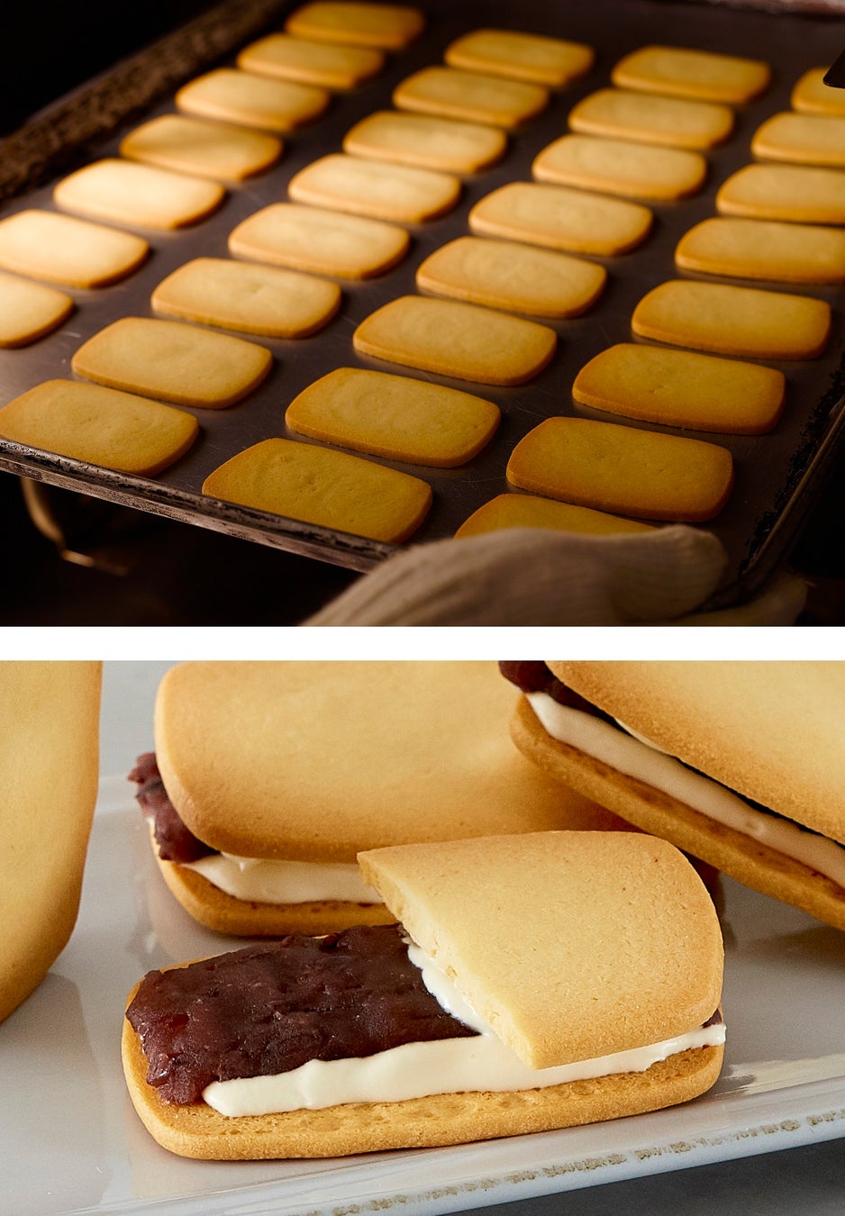 店内で焼き上げるサクッサク食感の「北海道ミルククッキー」に北海道産バターでつくる芳醇な香りのバタークリームと、十勝産小豆から作る風味豊かなつぶ餡をサンドしました。ミルクとバターの風味、つぶ餡のやさしい味わい、サクッときめ細やかなクッキーの食感との組合せが一体となって、際立つおいしさを作り上げます。十勝産小豆をこだわりの天然水と北海道産てんさい糖でふっくらと食感を生かし、やさしく炊き上げたつぶ餡など、北海道の素材にこだわっています。