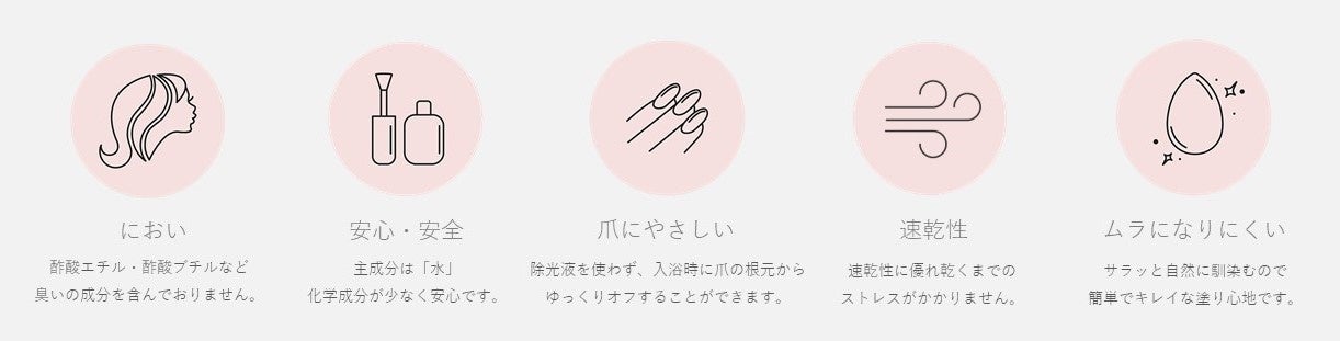 主に流通する石油溶剤ネイルポリッシュ(マニキュア)と違って臭いがなく化学成分も少ないので、爪はもちろん妊婦の方や小さいお子さま、ペットにも優しく安心してご使用できます。