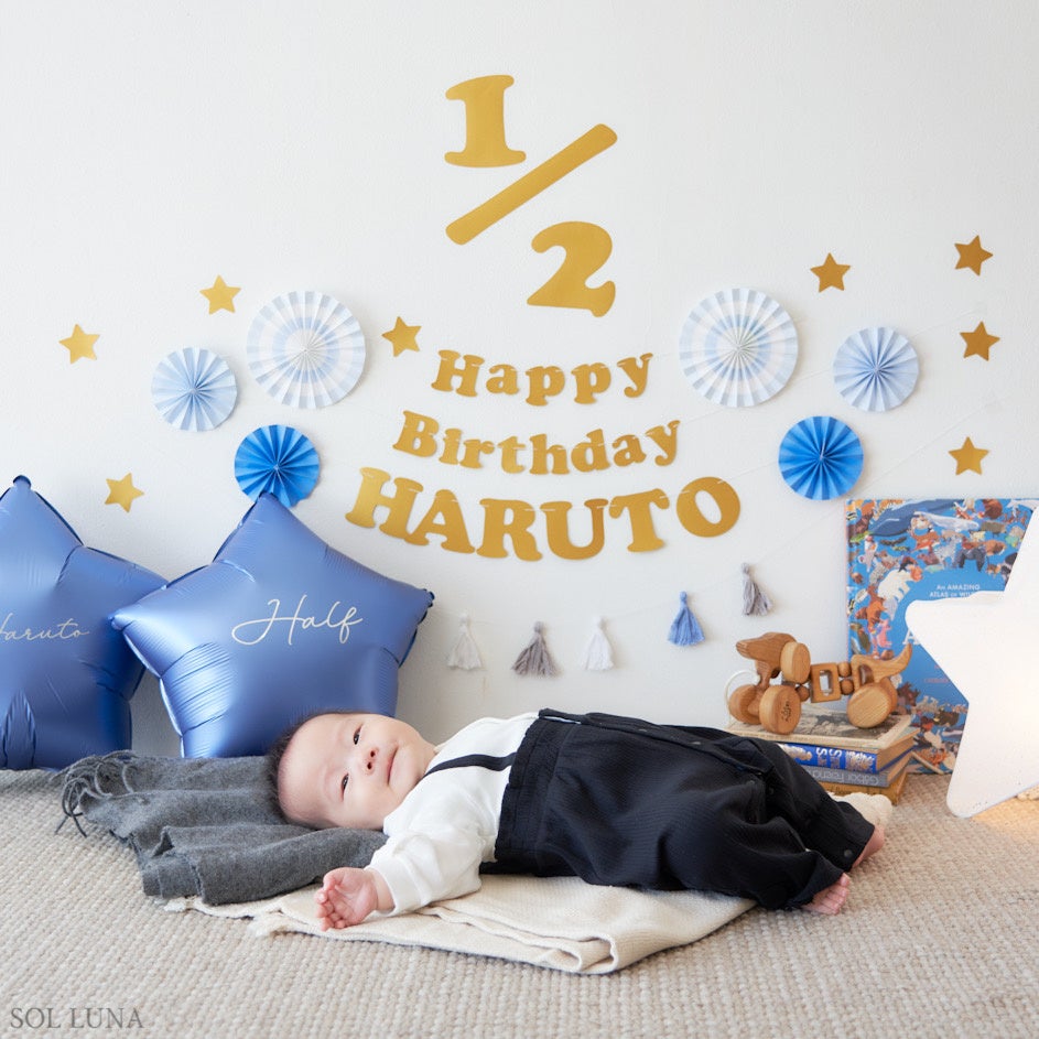 飾り付けアイテムは誕生日用だけではなく、ハーフバースデーや100日祝いなど近年お祝いする人が増えている記念日にも対応。また飾り付けは派手であるべきだという固定概念から抜け出し、日本の住環境に合う省スペースができる商品サイズにこだわりました。60×90cmの広さがあれば飾り付けができ、床に置いても使用できるので首が座っていない赤ちゃんでも簡単に撮影ができます。