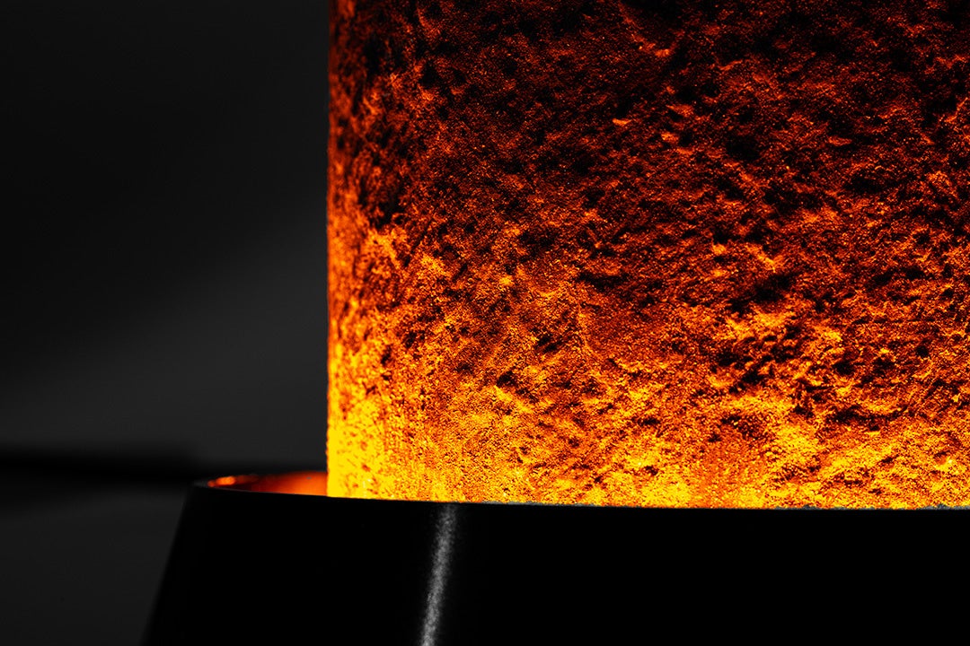 ライティングオブジェクトとして、本作では台座を金属で制作し、その内部にLED照明を仕込んでいます。光の色合いは黄色に近く、土の色味と合わさる事でより濃く、深いオレンジ色の温かみのある光の色彩となります。これは焼成のプロセスの中での1320度もの高温で焼かれる炎の力強さにも通じます。
