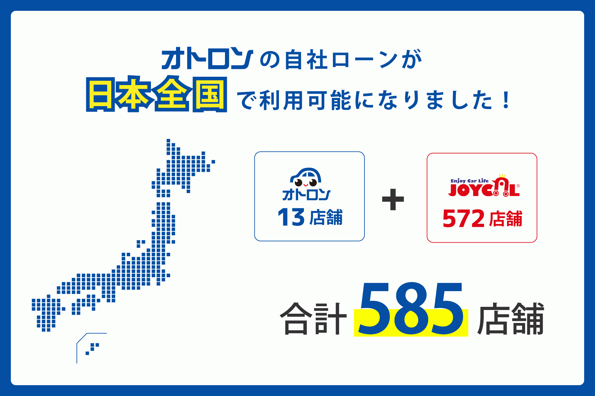 これまでは、関東圏内に12店舗、東北地方に2店舗出店しておりましたが、この度、全国に565店舗を展開するジョイカルと提携することにより、より多くのお客様へ「オトロンの自社ローン」を手軽にご利用していただくことが可能になりました。