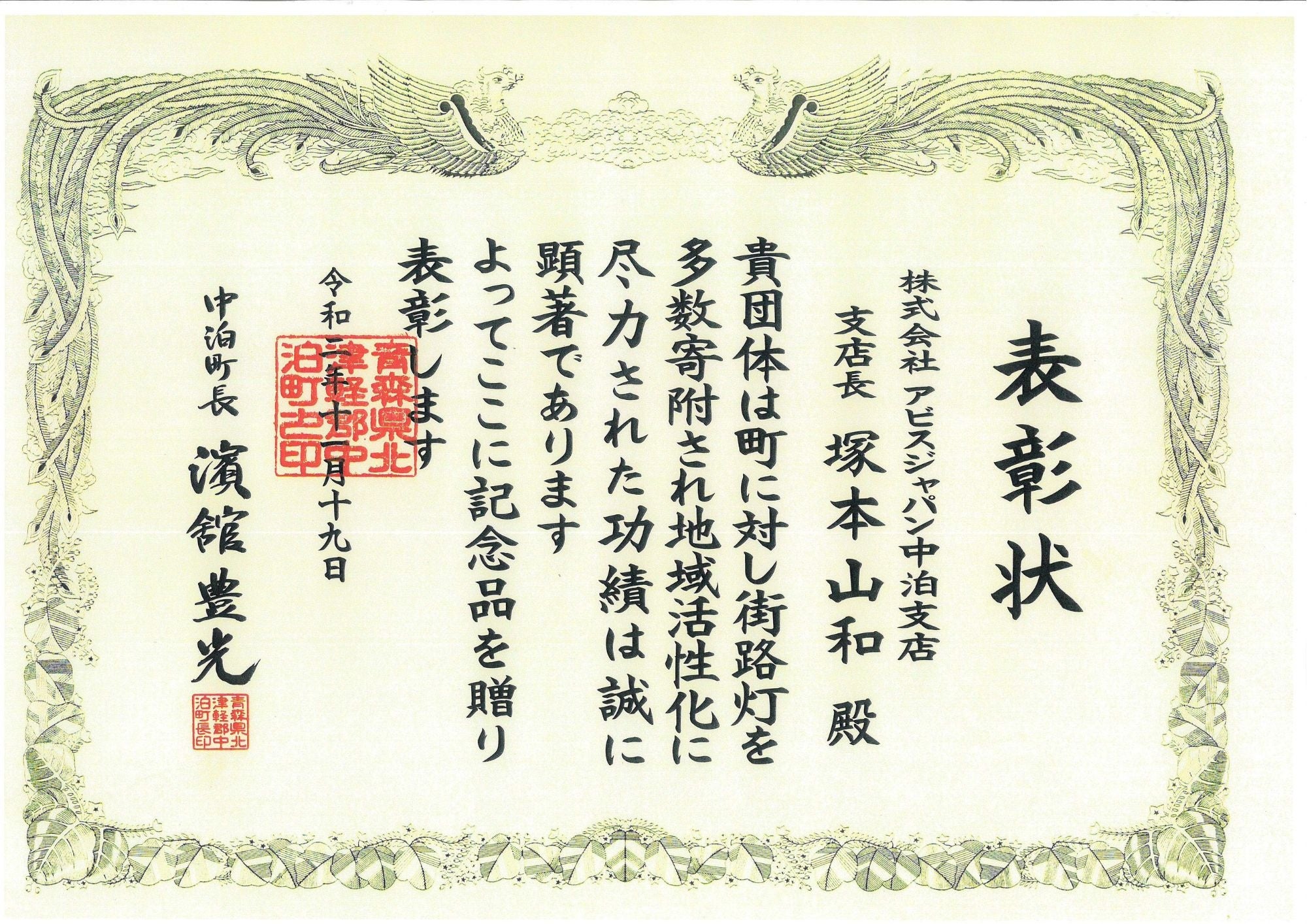 中里地域の商店街(派立通り)の復活を願い、街を明るくしたいと、街路灯用にLED電球製造灯具80個とその交換費用の寄附申出をアビスジャパン中泊営業所(所長・塚本 山和)が行い、7月30日㈫には塚本所長から目録を濱舘町長へご贈呈申し上げました。