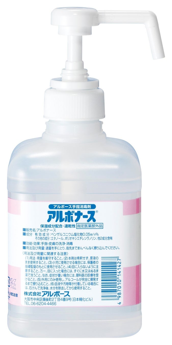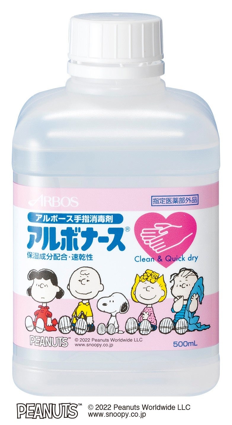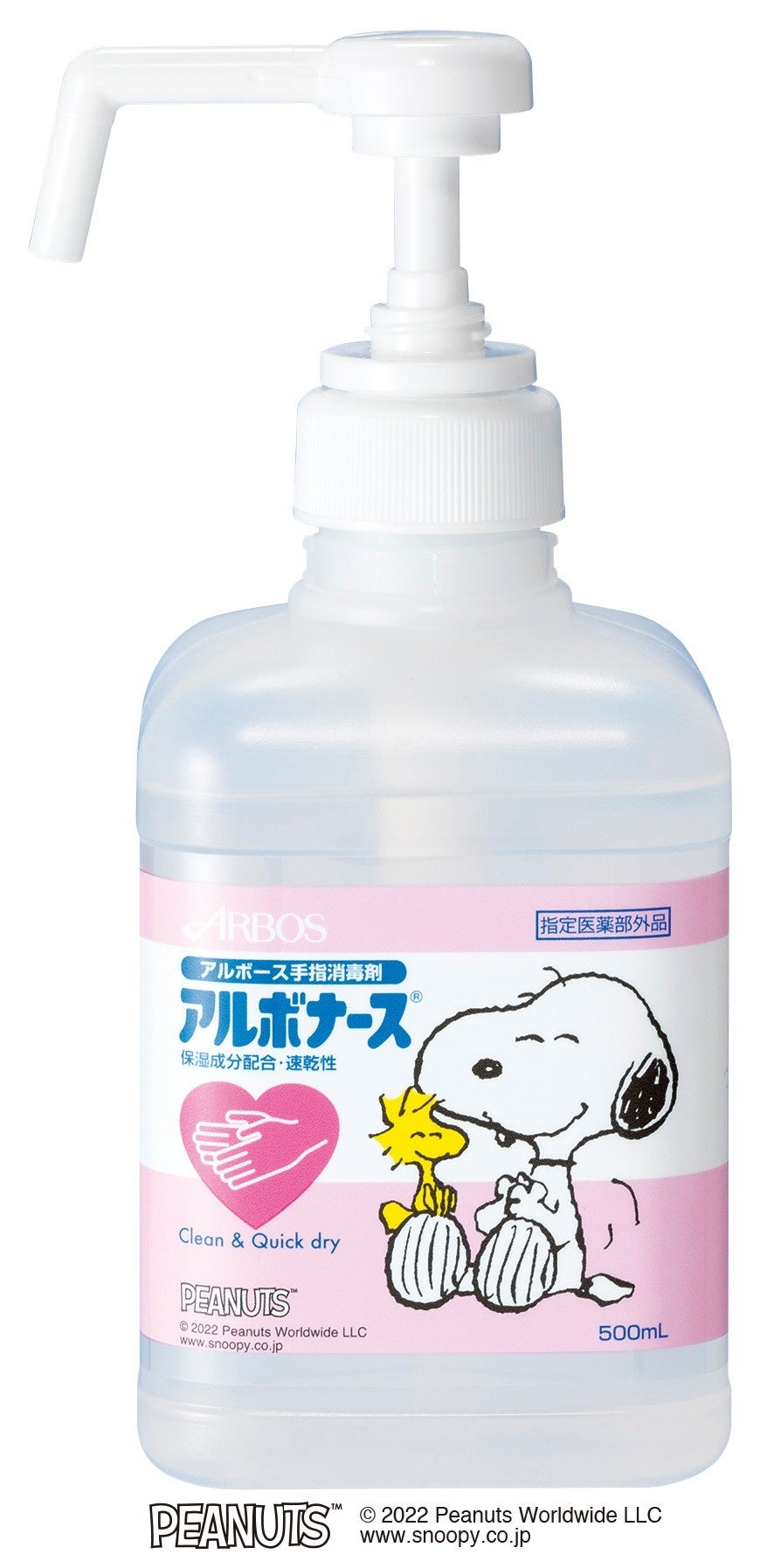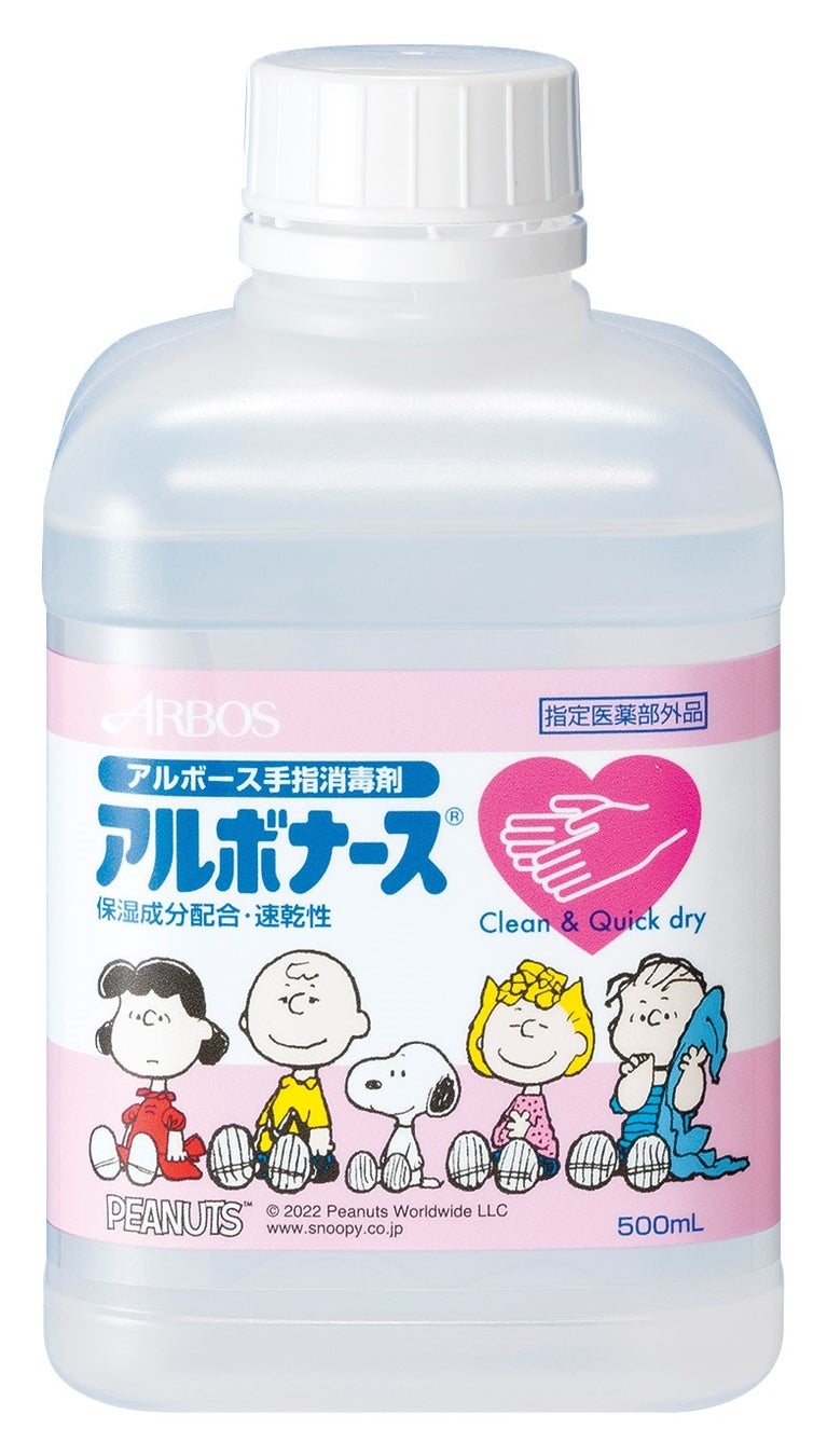 株式会社アルボース(本社:大阪市中央区、代表取締役社長:木野村 圭右)は業務用として好評いただいている手指消毒剤「アルボナース」(指定医薬部外品)の500mL(ポンプ付及びつけかえ用)を、「PEANUTSデザイン」に変更し、新発売いたします。