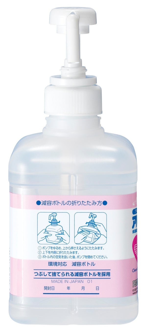 本品は、「ベンザルコニウム塩化物」を有効成分とした水洗い不要の速乾性の手指消毒剤で、広範囲の微生物に対して短時間で効力を発揮するのが特長です。天然由来の保湿成分を配合しており病院や介護施設など繰り返し手指消毒を行う施設でも多く採用いただいております。消防法上の危険物に該当せず、備蓄用としても扱いやすいと好評です。また、ポンプ付及びつけかえ用の容器は、従来の「アルボナース500mL」と同様に、使用後は折りたたんで捨てられる「環境対応・減容ボトル」を採用しております。