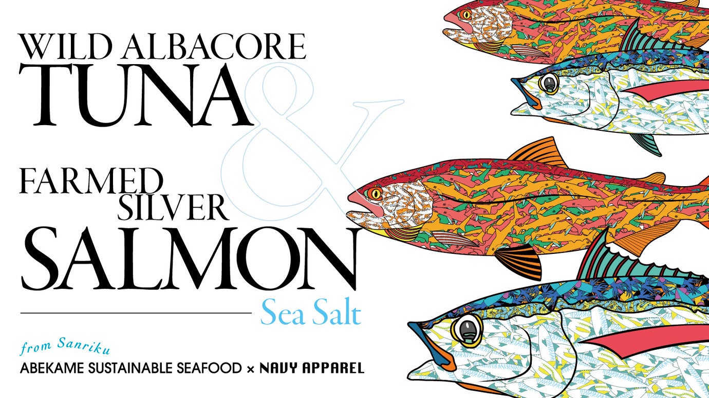 今回のコラボでは、ABEKAME SUSTAINABLE SEAFOODのツナとサーモンがNAVYAPPARELデザインのコラボパッケージになって限定生産されます。デザインには三陸の海で生きる様々な生物が散りばめられ、食物連鎖が表現されています。今まで魚に興味関心が無かった方々や、お子様や若者世代の方々にデザインを通じて魚や海の環境に興味を持ってもらいたいとの願いが込められています。また、デザインを通じてサステナブルシーフードとの出会いを体験してもらい、より身近にライフスタイルとして取り入れて貰いたいとの狙いがあります。