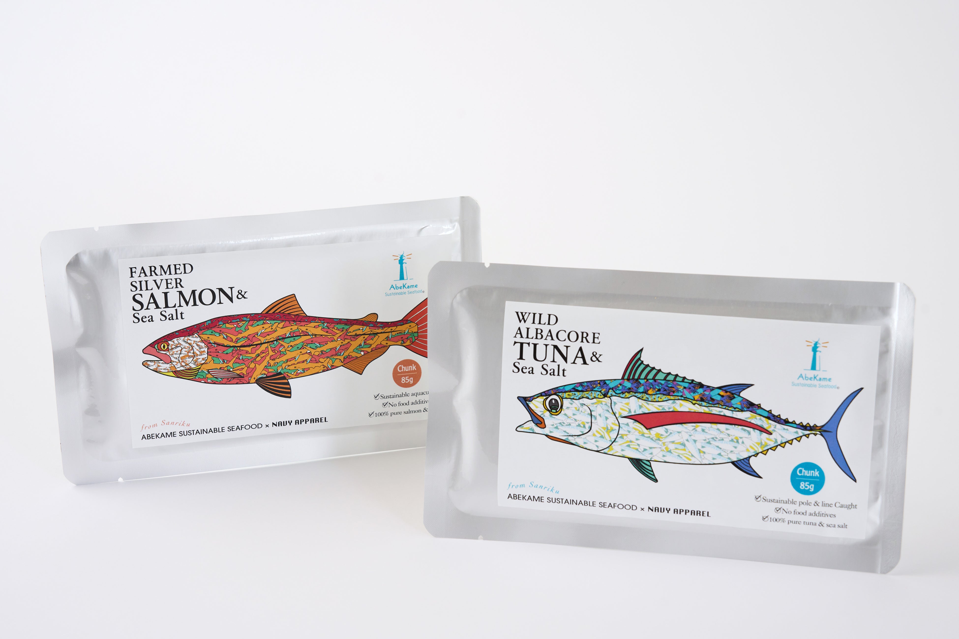 同社は三陸産のサステナブルな水産物をノンフローズンで加工したレトルトパック製品を、自社ブランド〔ABEKAME SUSTAINABLE SEAFOOD〕として製造販売しており、製品化第一弾である気仙沼産一本釣りビンナガを使用したツナ、第二弾の石巻産養殖銀鮭を使用したサーモンレトルトパックをラインナップしています。