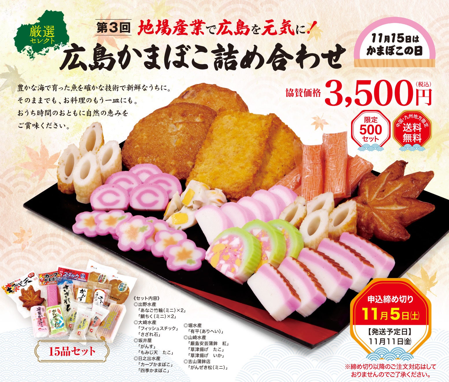 2022年11月15日かまぼこの日に合わせ、組合員7社15品の広島かまぼこ詰め合わせを限定500セット発売致します。