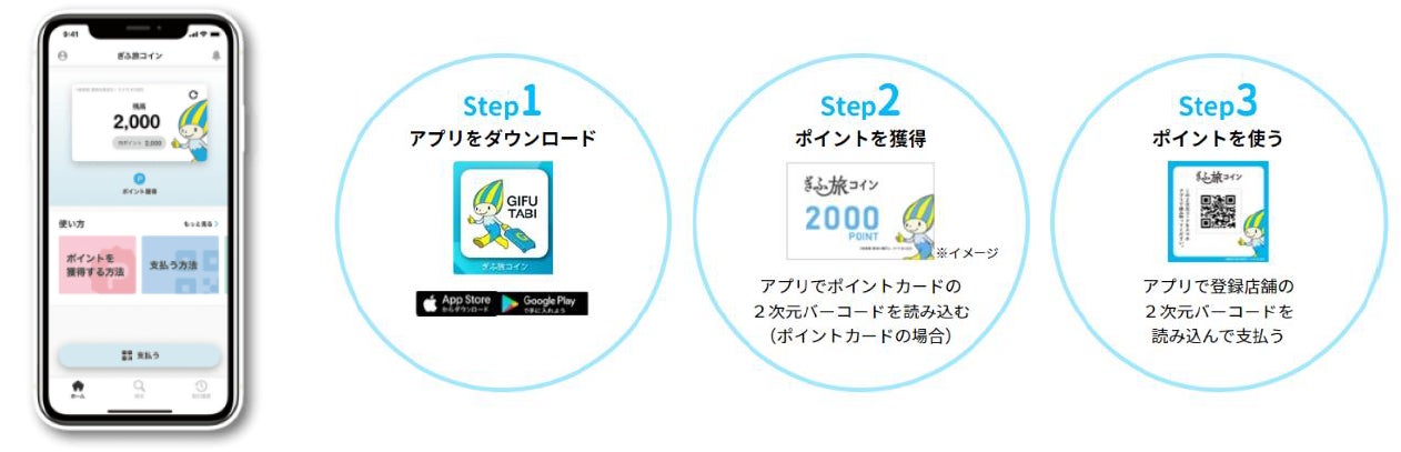 まず、利用者はスマートフォンから「ぎふ旅コイン」アプリをダウンロードし、宿泊施設等で配布するポイントカードに記載の2次元バーコードをアプリで読み込み、電子ポイントを獲得していただきます。獲得した電子ポイントは、登録店舗の2次元バーコードをアプリで読み込むことで、1ポイント=1円でお支払に利用いただけます。