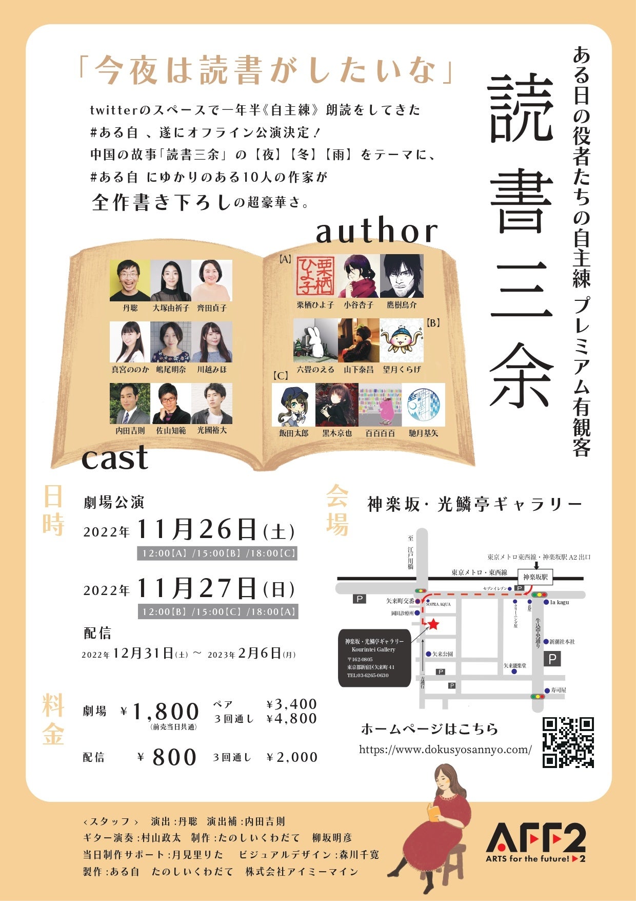 タイトルの「読書三余」は中国の故事で、『読書に適する三つの余暇』【雨】【冬】【夜】を指します。この中からテーマを選んで作家陣に書いて頂き、お客様が公演後に「今夜は読書をしたいな」と思われるような、素敵な時間と空間づくりを目指します。また、今回の書下ろし作品はアンソロジーにとして収録し、購入も可能です。
