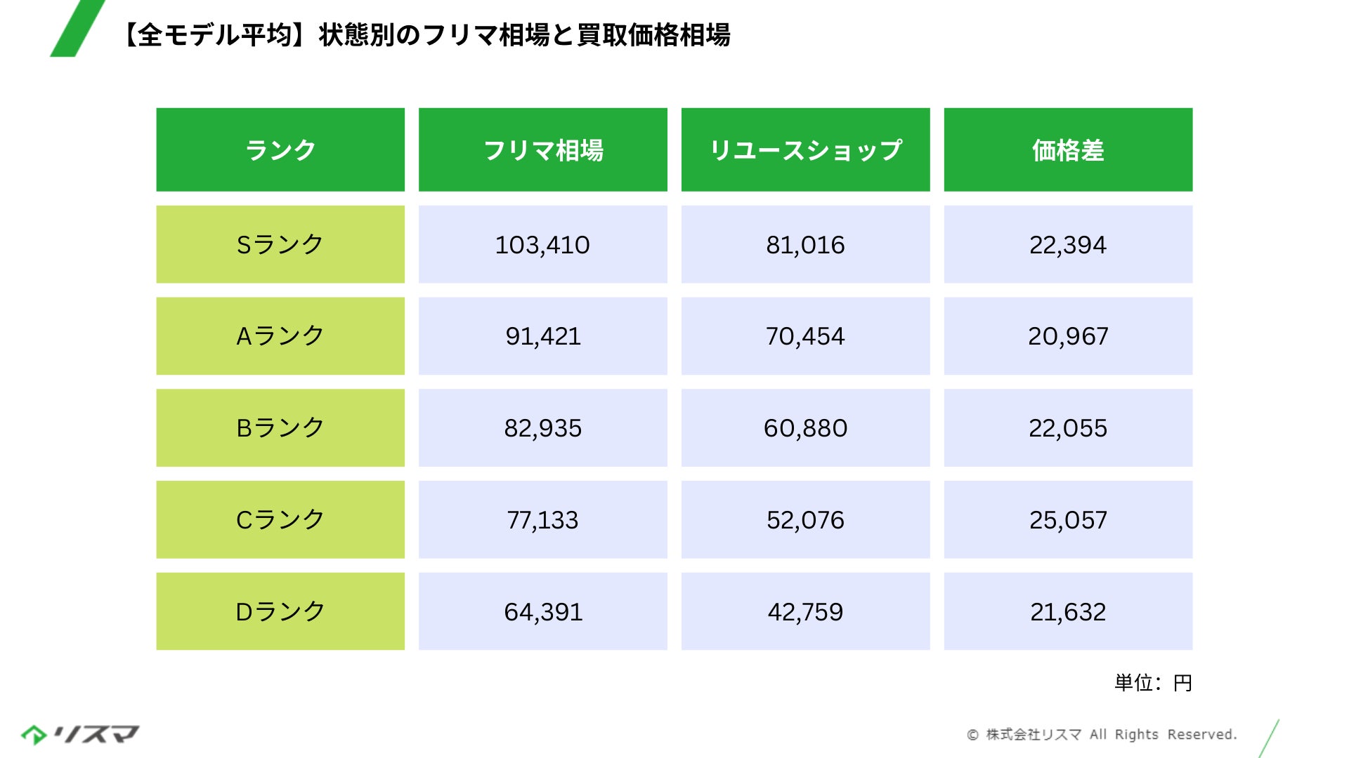 買取価格の相場は状態・モデルにより、フリマ相場を超えるものから、フリマ相場の半額まで多岐にわたります。そのなかで見られた傾向としては、SランクからAランクまでの比較的状態のよいモデルのほうが、フリマ相場に近い価格での買取を行っている事が挙げられます。