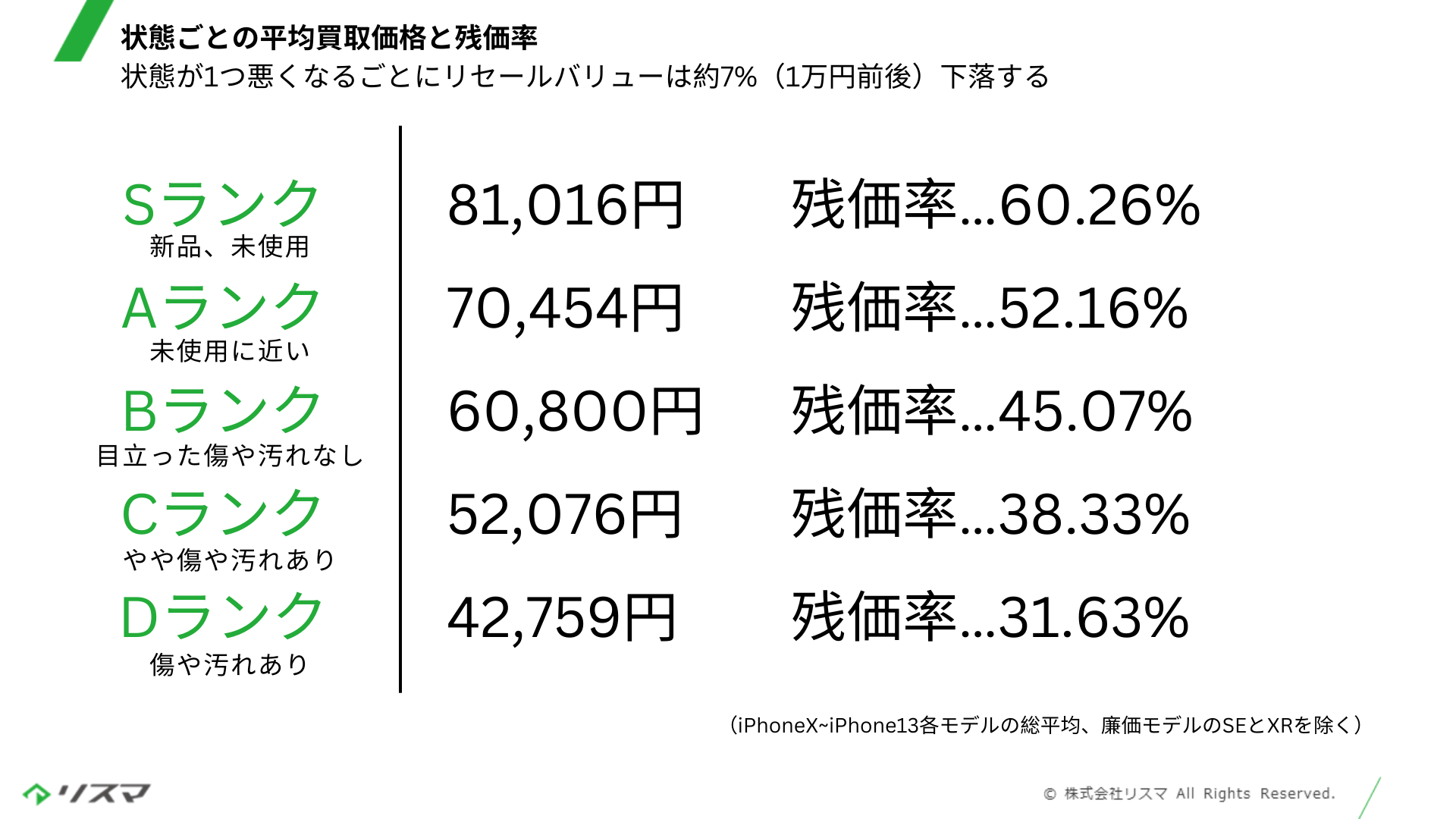 ◆状態のランクが下がるごとにリセールバリューは約7%落ちる