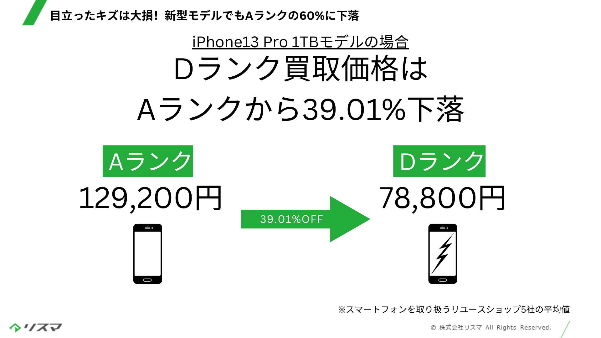 新型モデルでも傷の影響を大きく受けることが分かりました。例えば比較的発売が新しいiPhone13 Pro 1TBでは、Aランクの買取価格129,200円に比べ、Dランクの買取価格は39%下落し、わずか78,800円となります。