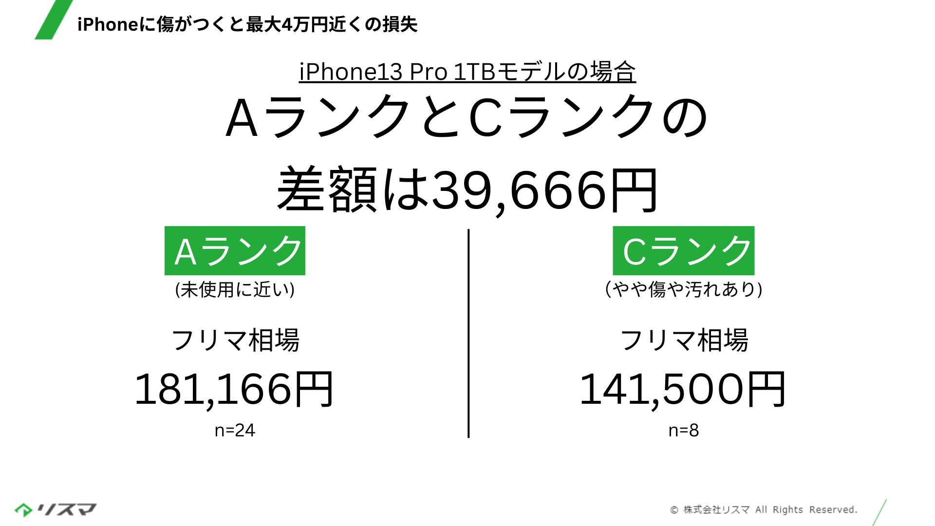 最も差が開いたモデルはiPhone13 Pro 1TBモデルで、Aランクの相場181,166円に対し、Cランクは141,500円に下落します。差額は39,666円となります。