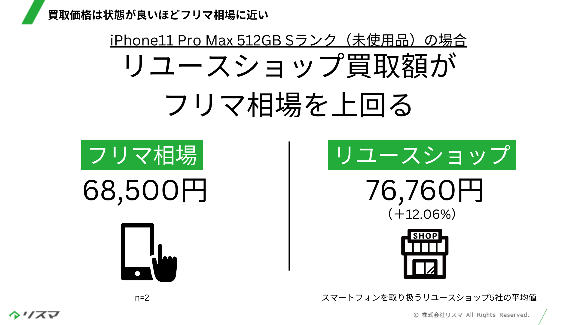 例えばSランクでは、iPhone 11 Pro Max 512GBモデルがフリマ相場を超える買取相場を出していました。フリマ相場が68,500円に対し、リユースショップの相場は76,760円で、8,260円上回ります。