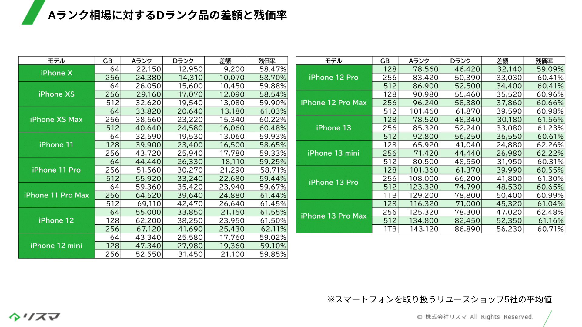 iPhoneXからiPhone13シリーズまで、AランクとDランクの買取相場を比較したところ、Aランク相場に対するDランク品の残価率は58.47%~62.48%となりました。