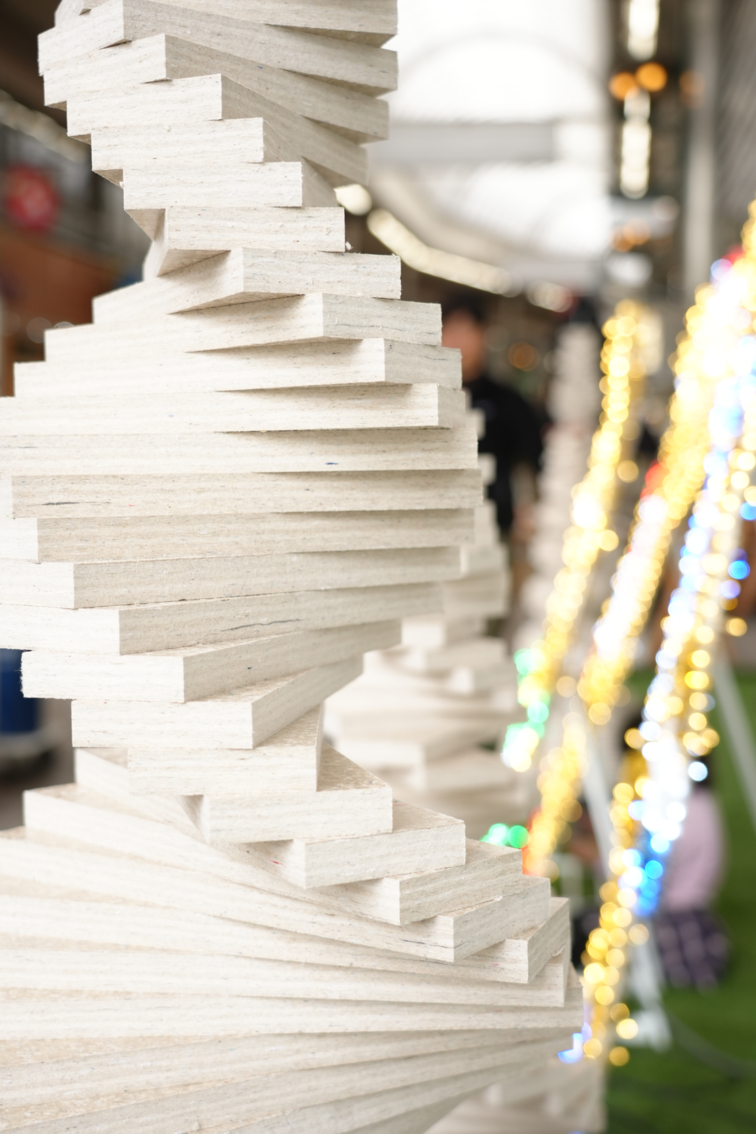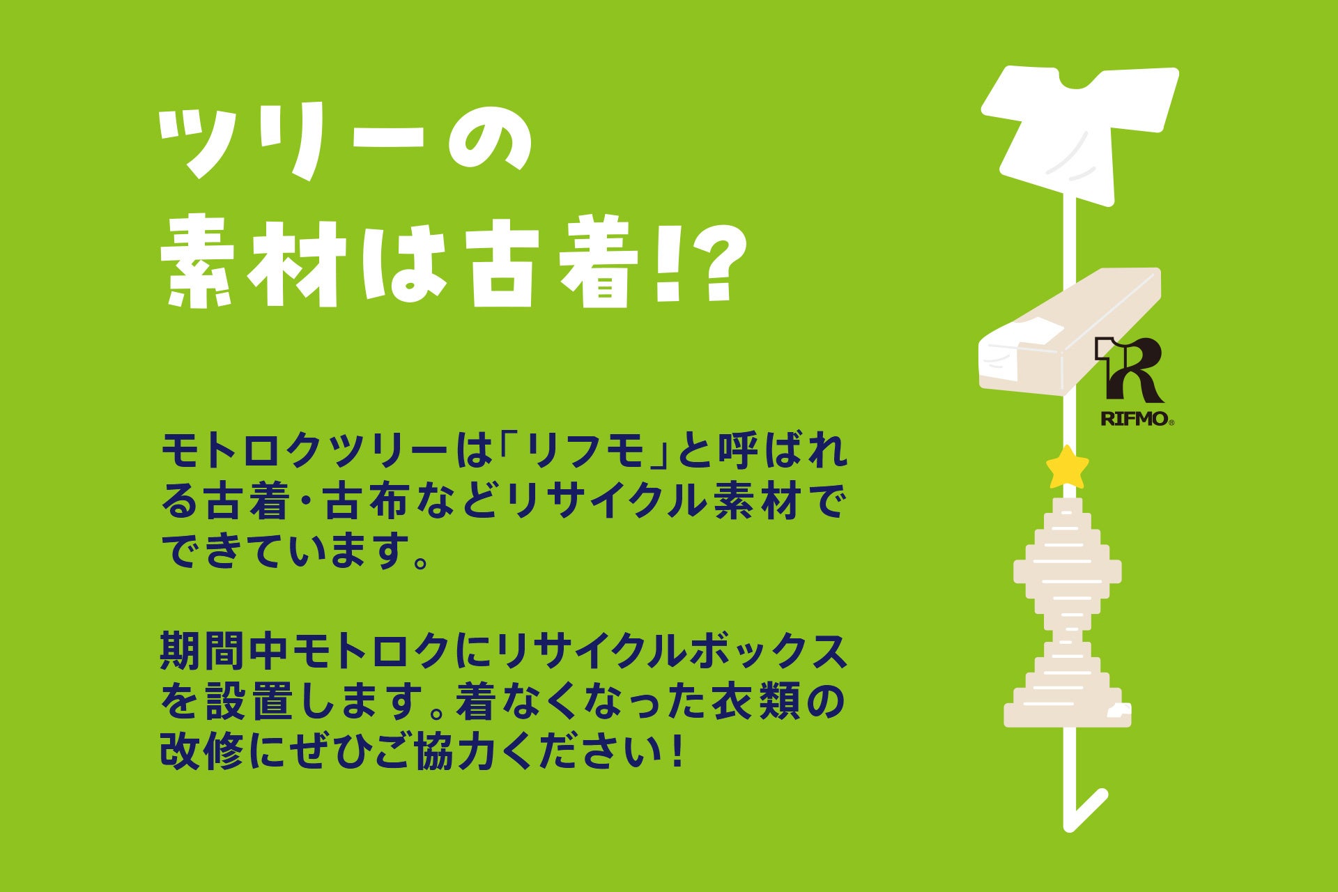 ツリーは「リフモ」と呼ばれる100%繊維系廃材からできたリサイクル素材でできています。家庭から排出される古着、古布など繊維系廃棄物は年間200万トン以上ですが、リサイクル用途は工場用の雑巾や輸出向け古着など非常に限られており、リサイクル率はわずか10%程度で今後も大幅に増える見込みは難しいのが現状です。リフモはこれまで活用できずに廃棄されてきた衣類など繊維系廃棄物だけで出来ており、着なくなった衣類は「ゴミ」ではなく「資源」であるという価値を創造し、衣類リサイクルを推進することができます。リフモを使うことで衣類の廃棄削減に貢献できるのです。