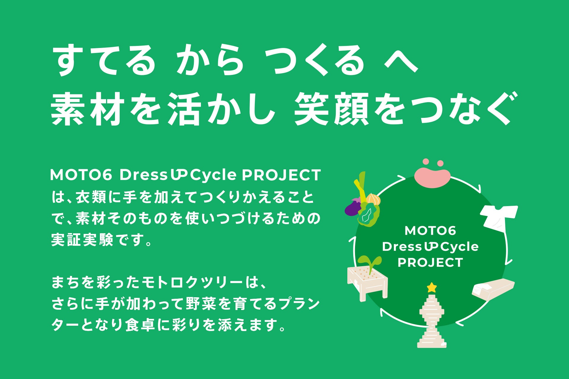 暮らしに「捨てない選択肢」を増やすプロジェクト『 MOTO6 Dress UP Cycle PROJECT』を開始します。「商店街だからできるサーキュラーエコノミー」をテーマに、多くの方へ参加の接点を提供する多様な循環サービスを展開することで、食と暮らしを起点としたサーキュラーエコノミーを根付かせ、商店街でサステナブルな未来を創ることを目指します。「買って、使って、捨てる」という従来の大量生産・大量消費型経済から、「作って、使って、また生かす」資源循環型の新しいライフスタイルを提案します。