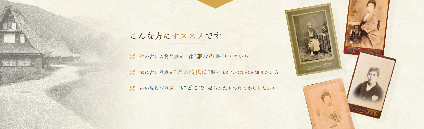 ご先祖が残した貴重な古写真であっても、内容がわからなければ宝の持ちぐされになってしまいます。持ち主が亡くなってしまい、正体不明となってしまった写真をお持ちの方に古写真鑑定はオススメです。