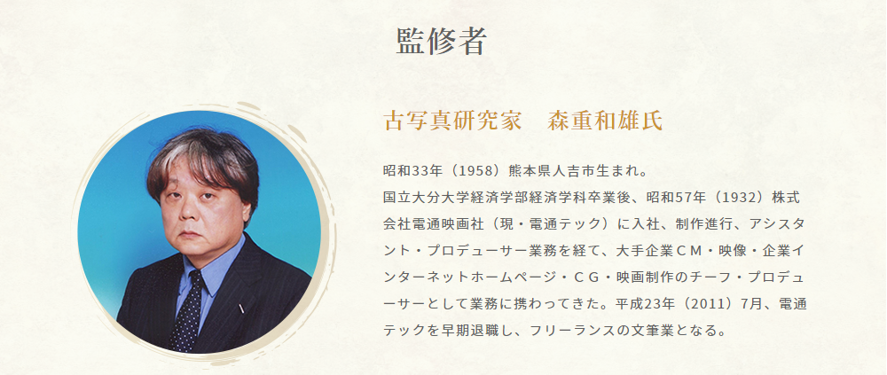 家樹では、数々の著書を持ち古写真研究家としても著名な森重和雄氏の監修のもと、サービスを提供してまいります。家樹の組織力・調査力と森重氏の豊富な知見を融合させることにより、多くのお客様に高品質のサービスを提供していく所存です。