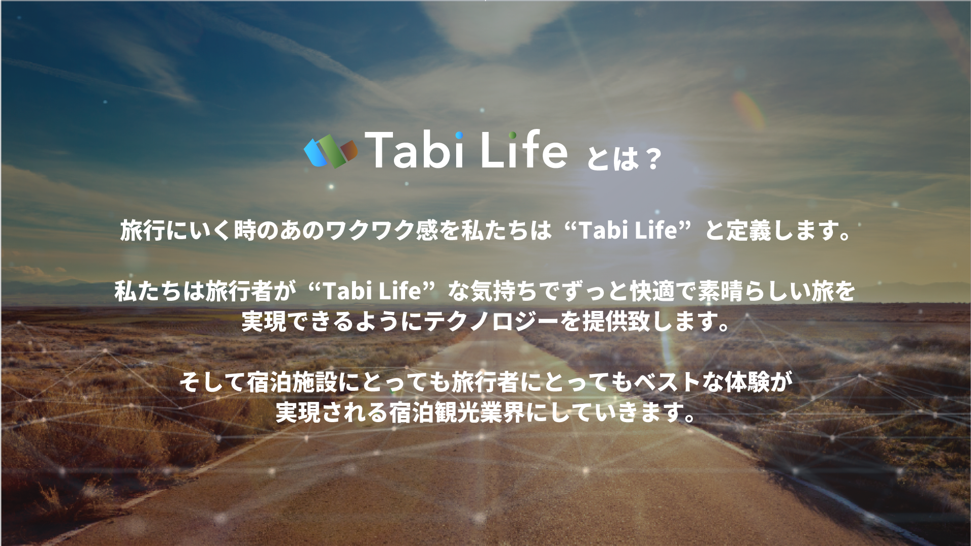 新社名にも使用している”Tabi Life”とは、旅行にいく時のあのワクワク感を私たちは“Tabi Life”と定義しています。旅行者が“Tabi Life”な気持ちでずっと快適で素晴らしい旅を実現できるように宿泊施設及び旅行者にテクノロジーを提供致します。そして宿泊施設にとっても旅行者にとってもベストな体験が実現される宿泊観光業界にしていきます。
