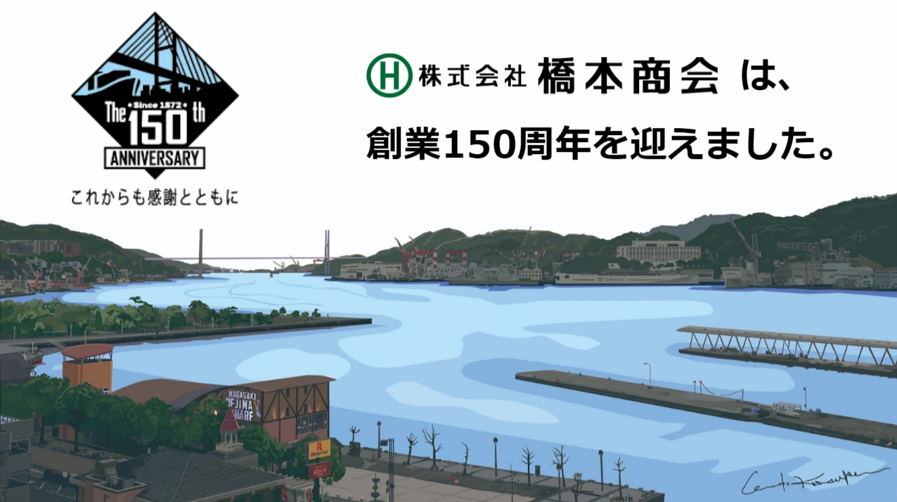 橋本商会コーポレートサイト内に、150周年記念ページを作成し、150周年記念ビジュアル及び、長崎の街並みをイラスト化した画像の掲載、普段より大変お世話になっております株式会社十八親和銀行 取締役会長 吉澤俊介様、株式会社テレビ長崎 代表取締役社長 宮前周司様にいただきました祝辞を掲載いたしました。