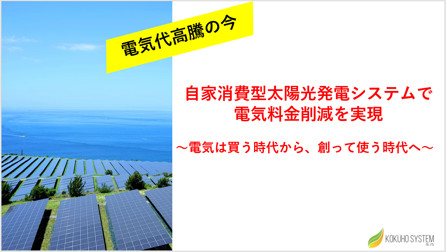 2022年11月11日(金) 神奈川県藤沢市にて株式会社コクホーシステムによる「自家消費型太陽光設備のご提案に向けて」と題した無料セミナーを行います。新規事業を考えている企業様、時代の流れに乗るのは今です! 大きな収益に繋がる新事業を専門知識を持つ企画・設計を弊社が支援いたします。セミナーに足をお運びください。