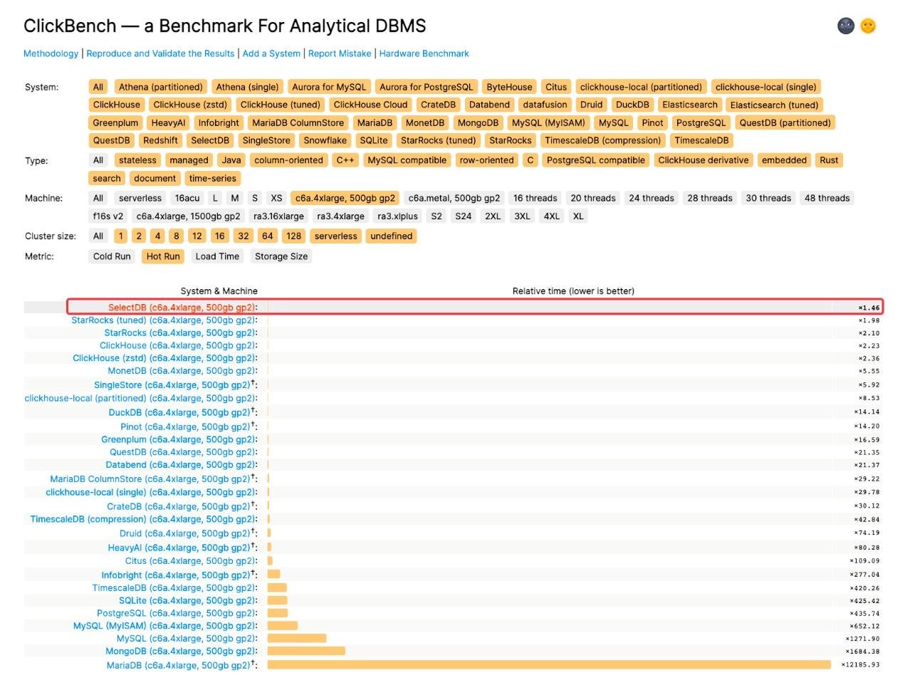 2022年10月8日、北京フライホイールデータテクノロジーの次世代クラウドネイティブのリアルタイムデータウェアハウス SelectDB は、グローバル分析型データベースのパフォーマンスランキング ClickBench の c6a.4xlarge,500gb gp2 モデルで首位にランクインし、多くの指標が上位にランクインした。