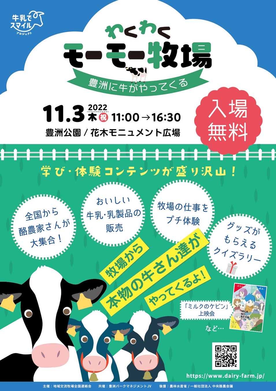 地域交流牧場全国連絡会(所在地:東京都千代田区、会員数:293)は、酪農や牛乳のファンを増やすことを目的に、11月3日(木・祝)に豊洲公園にて、消費者交流イベント「わくわくモーモー牧場~豊洲に牛がやってくる~」を開催します。