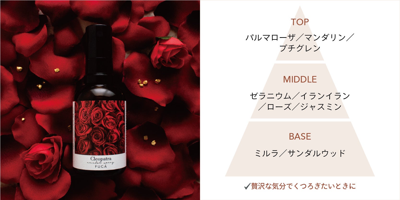 クレオパトラの寝室を彷彿とさせる、甘美で魅惑的なオリエンタルフローラルノート。