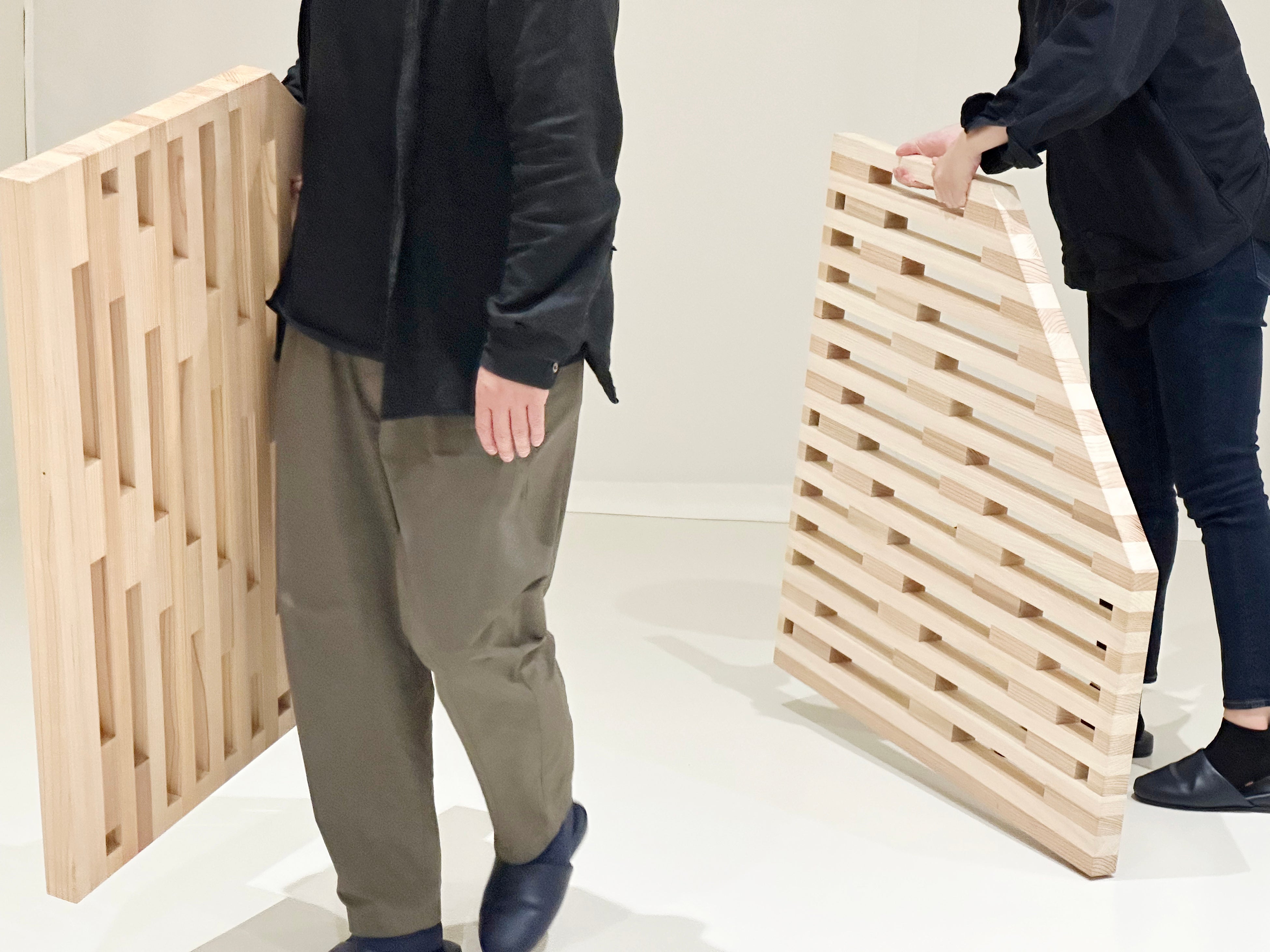 BeLINは、ヒノキとスギの無垢材から生まれました。ヒノキ7:スギ3、真庭に生育する木々と同じ比率でできているパネルは、真庭の森林そのもの。この木材で、どんな未来を描くことができるか。それは、丁寧に育てられ製材された木の可能性をひろげることであり、木のまち真庭のこれからを考えることでもあります。BeLINは、パネルをつなぎ合わせ、木の空間を自在に生み出すことができる木材です。ライフスタイルを拡張させると共に、美しい森林を持続させていく。無垢材を生かすプロダクトが起点となり、森林、木材の仕事、木がそばにある暮らしを結び、未来へとつながる循環を育てていきたいという願いが込められています。都心や室内にいても、パネルの隙間から木漏れ日が降りそそぐ。これまで森林とつながりのなかった場所へも、木のぬくもりを届けることができる。BeLINは、丁寧に作られた木材を通して、もっとあたらしい喜びを届けられる可能性があることを問いかけてくれます。