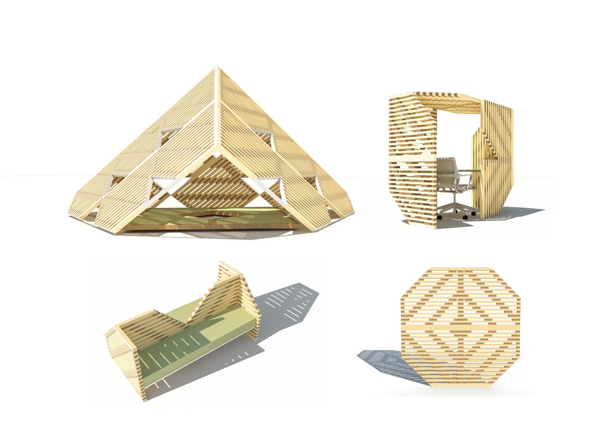 BeLINを使用したテントやワークスペース、ベンチなどのコンセプトモデルを展開。またプロジェクトの背景となる、真庭の「山・木・製材」に関するパネル展示も。