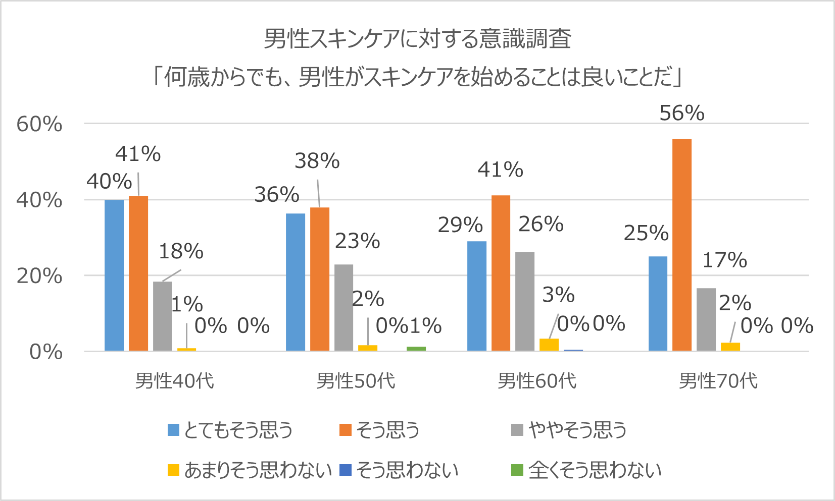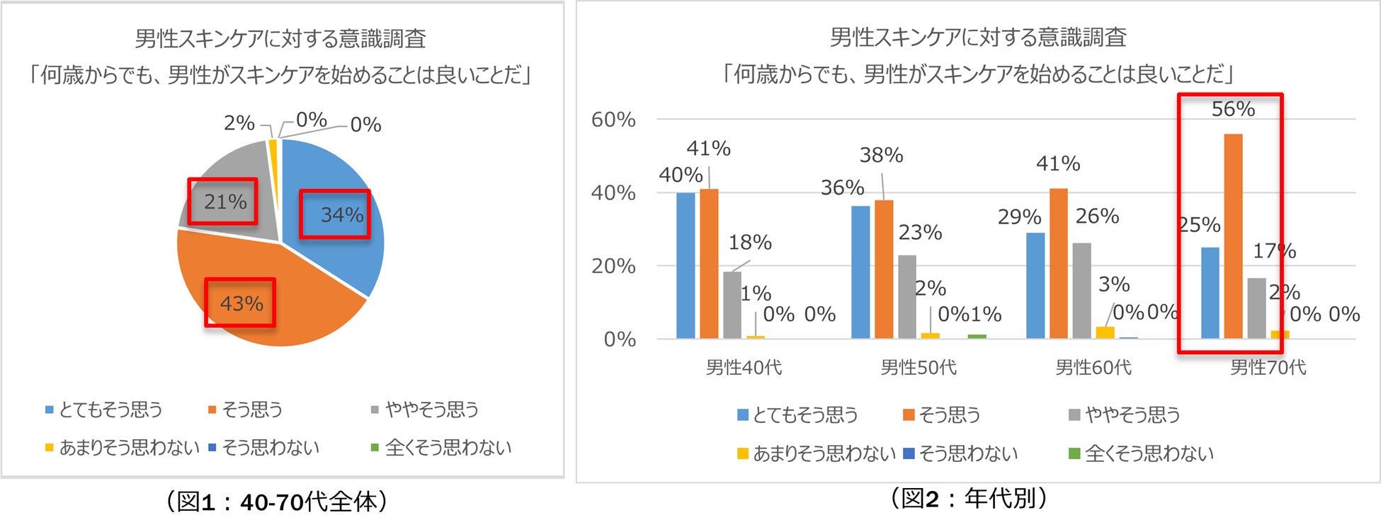 近年、メンズスキンケア市場が伸長している中、40代~70代の男性を対象にスキンケアに関するアンケート※3を当社で実施しました。アンケートによると「何歳からでも男性がスキンケアすることはいいことだと思う」と回答した割合は98%(図1)とかなり高く、70代でも98%(図2)と、若年層のみでなく、ミドル層からシニア層にいたるまでスキンケアに関する意識が高いことが分かりました。