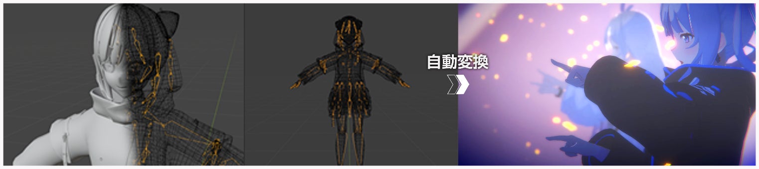 一般的なバーチャルライブシステムでは、バーチャルキャラクターを動かすのに必要な骨構造や表情などアバター仕様をシステムごとに定義しており、利用するシステムごとにセットアップを行いキャラクターモデルを修正・調整する必要がある場合もあります。一方、本システムでは、自社・他社を問わず、バーチャルキャラクターモデル導入におけるデータ構造を最適化するツールの開発により、従来は手動で行われていたアバターモデル形式からの変換を自動化することが可能です。