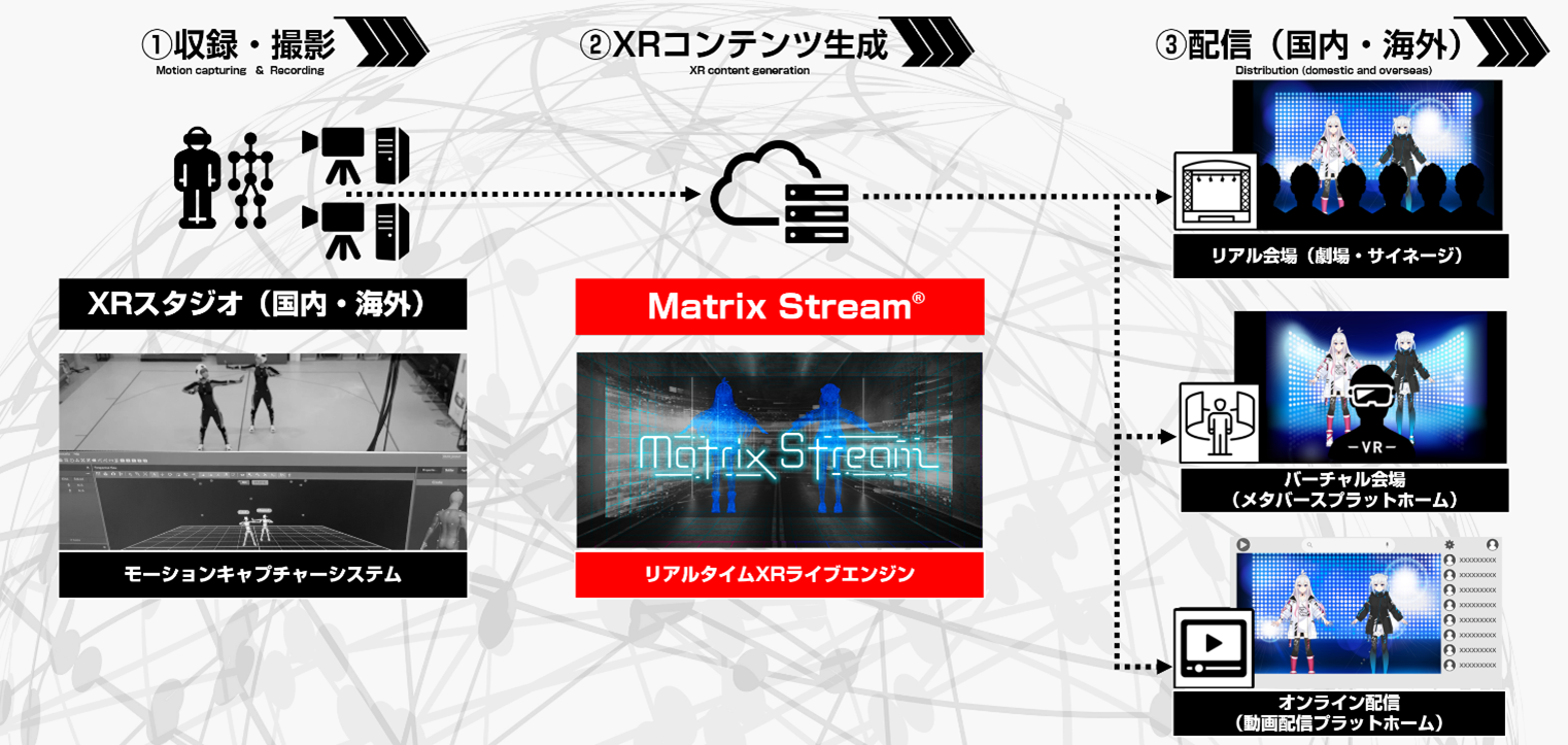 本システムは、XRスタジオのモーションキャプチャなど、演者のデータをリアルタイムにバーチャル空間上のキャラクターの動きとしてXRコンテンツを生成します。生成したXRコンテンツは、本システムによりXR技術を活用した音楽ライブや番組として、リアル会場のスクリーンへの配信・VR配信・オンライン配信など、複数の配信形態において同時配信が可能になります。