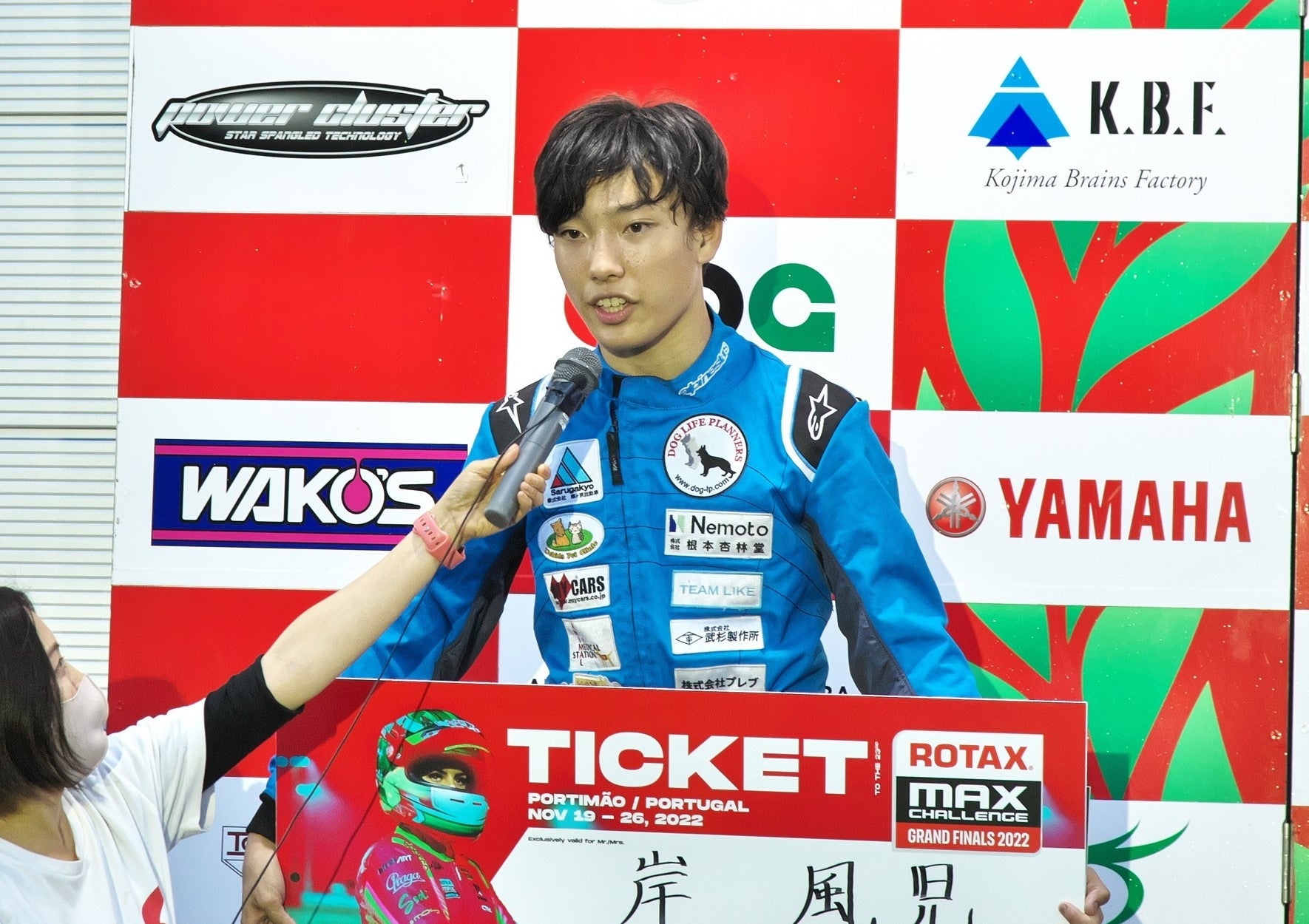 岸 風児は静岡県にある“オートパラダイス御殿場シリーズ”でシーズン序盤から首位を堅持。それにより獲得した累計ポイントと9月25日に同コースで行われたイベントレース、“2022 MAX FESTIVAL IN APG”で2位入賞を果たし、当該レースで獲得したポイントの合算をもって、2022年11月26日にポルトガルのポルティマオで行われる”2022 ROTAX MAX GRAND FINALS IN PORTUGAL”参加のために日本へ割り当てられた代表権(本年の割り当ては成績上位2名)を獲得し、SENIORMAXクラスへのステップアップ初年度での代表入りという快挙を成し遂げました。