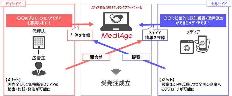 メディアマッチングプラットフォーム「MediAge(メディエイジ)」では、従来の広告流通のしくみを変え、全ての企業が目的に合った情報発信手段を選べるようにすることで、広告市場の拡大および日本全体の活性化に貢献することを目指していきます。