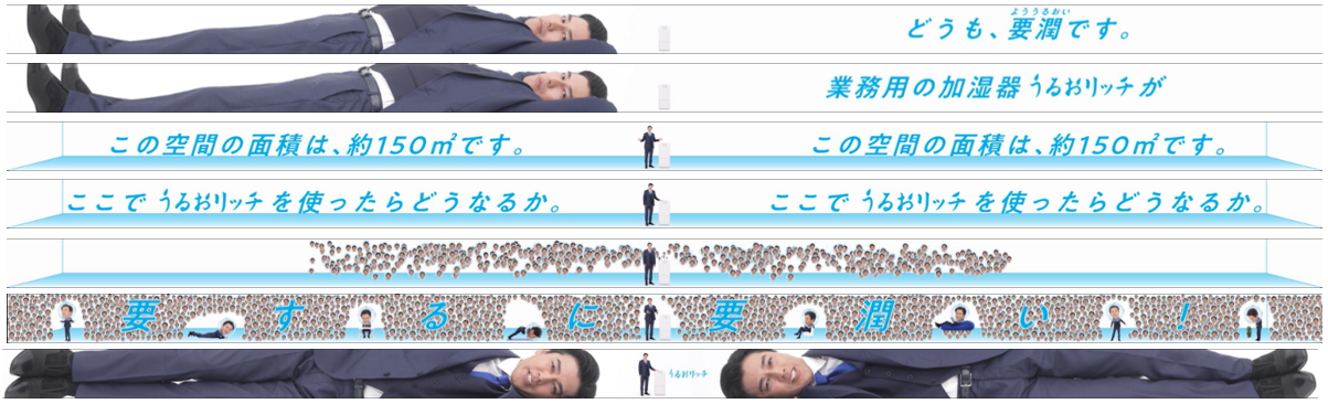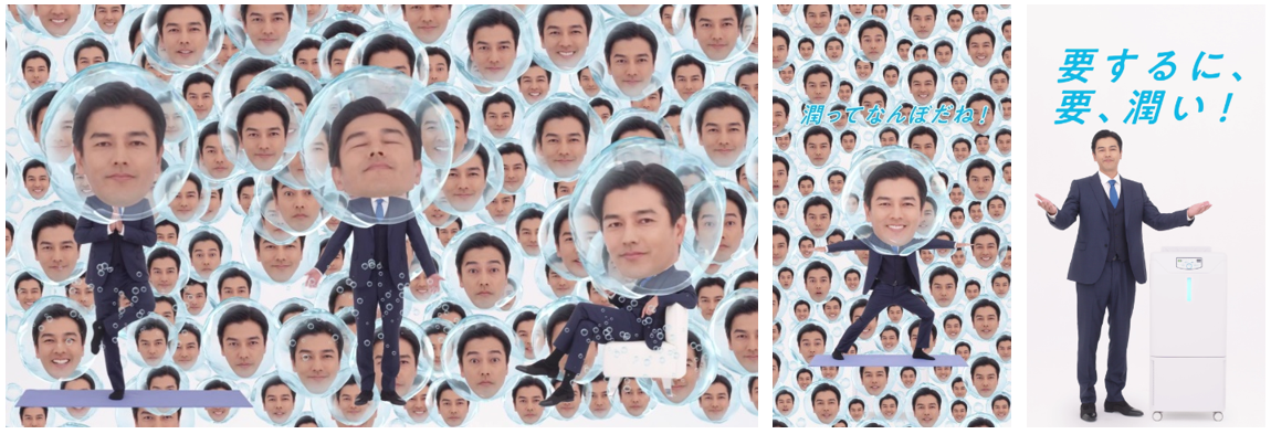 一台で約150㎡の空間まで対応可能な「うるおリッチ」にちなんで、巨大化した要さんが、横たわった状態で登場。見る人に「うるおリッチ」の加湿能力を訴えかけます。「うるおリッチ」の使用イメージをより分かりやすく伝えたい要さんは、水滴を模したたくさんの「潤玉(うるおいだま)」に変身。画面を埋め尽くします。潤玉の一部に体が生え、潤人間(うるおいにんげん)に進化すると、「潤ってるほうがいいもんなぁ…」「やっぱ、潤ってなんぼだね!」と、加湿の大切さをアピールします。