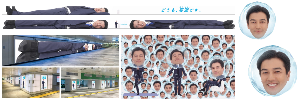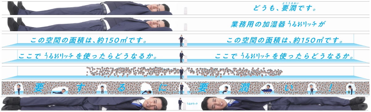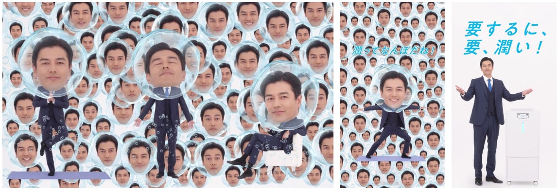 今回放映を開始する動画では、要潤さんがうるおいコンシェルジュ“要潤(よう うるおい)”として出演しています。業務用加湿器「うるおリッチ」は一台で約150㎡の空間まで加湿できることから、巨大化した要さんが出現。水滴を模したたくさんの「潤玉(うるおいだま)」となって、空間を潤いで満たすシュールな演出にも注目です。また、今回の動画は、YouTube等Web上でも視聴することができます。さらに、要さんにインタビューを実施。動画の見所に加えて、実際に巨大化したらしてみたいこと、残り2か月となった今年やり残したこと、ハロウィンの思い出などについて語っています。