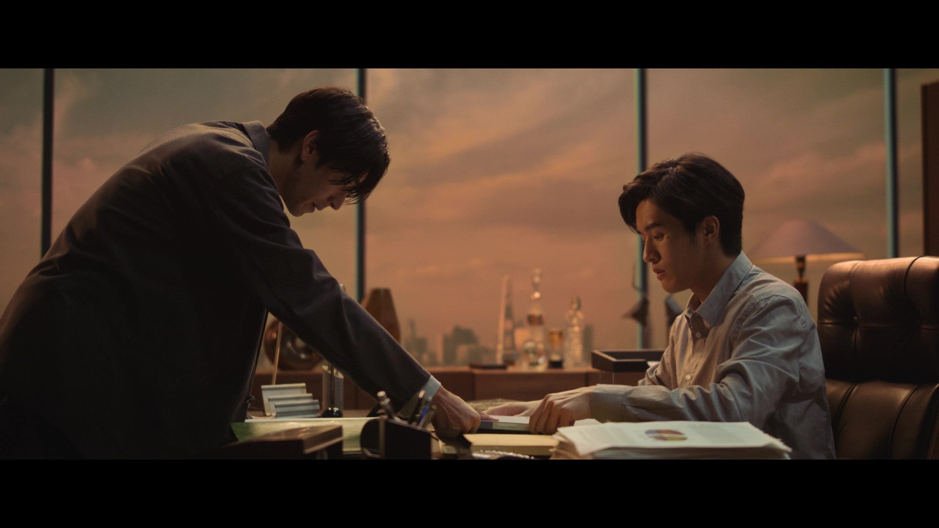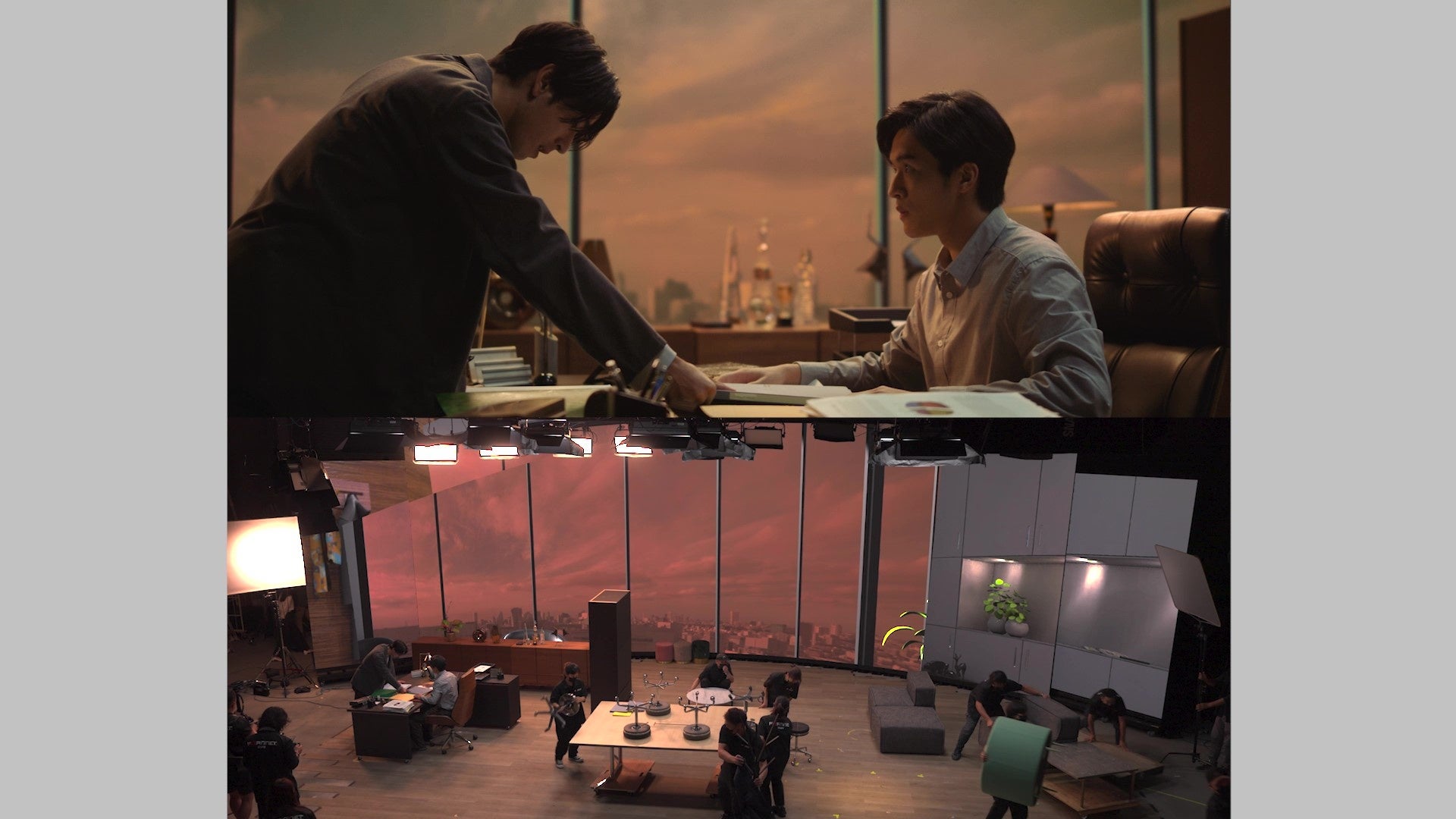 バーチャルプロダクションだから実現した見どころの1つは、タイムラプス風な表現です。社長室のシーンで主人公の心情とリンクして背景が変化する表現をしたく、窓抜けの空がタイムラプスで変わっていくことで表現しました。