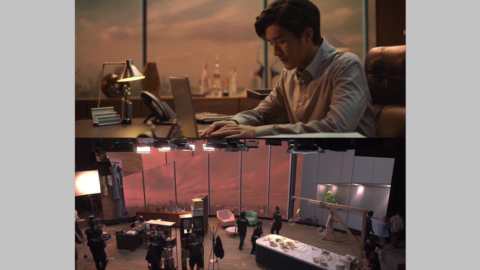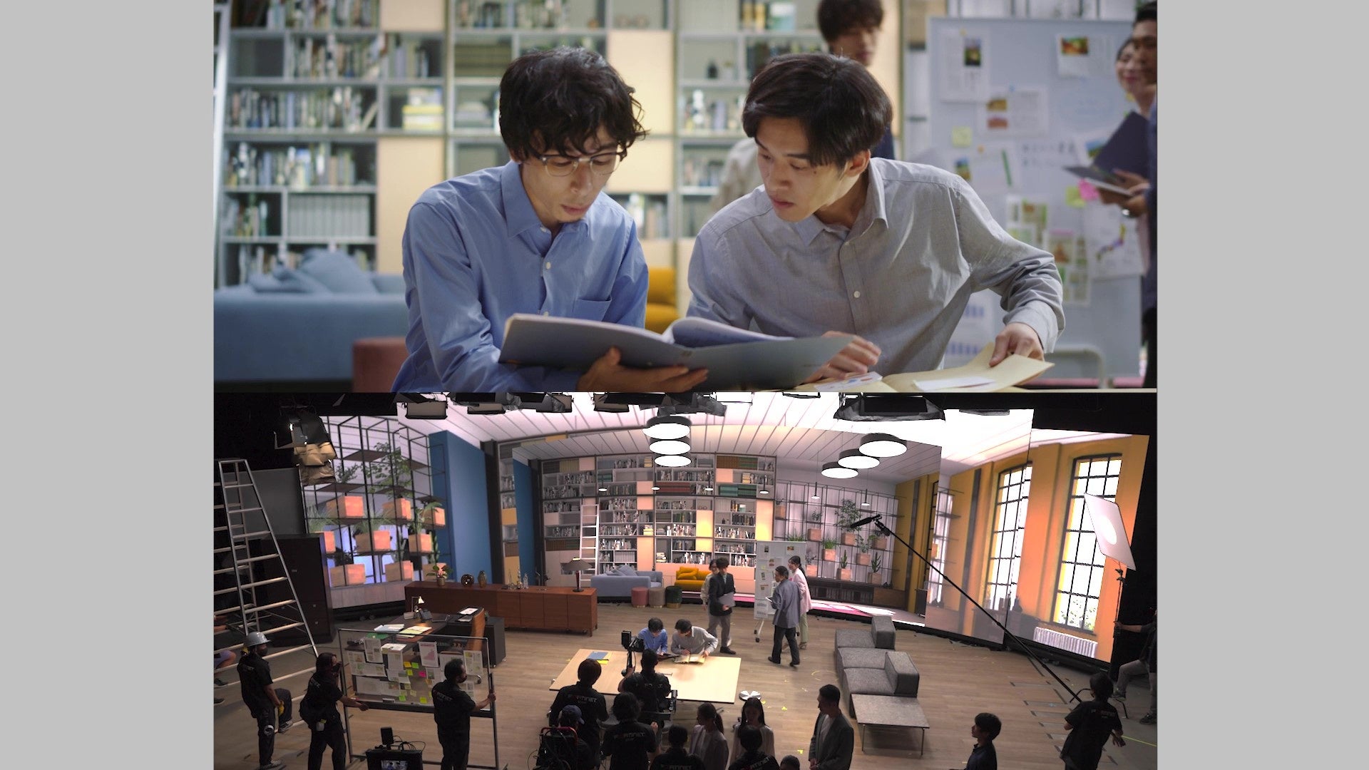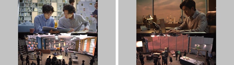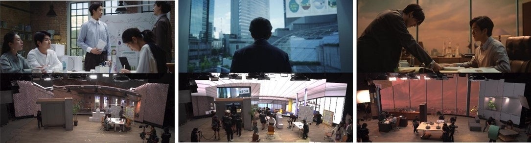 さらに、本動画は大型LED常設スタジオ『studio PX SEIJO』で撮影され、巨大なLEDウォールにCGで作られた高画質の仮想背景を映し出し、役者や舞台道具と同時に撮影し合成する技術「バーチャルプロダクション」を利用しています。これにより動画内では、理想の撮影シーンや、細やかな天気の移り変わりを自在に表現することが可能になりました。