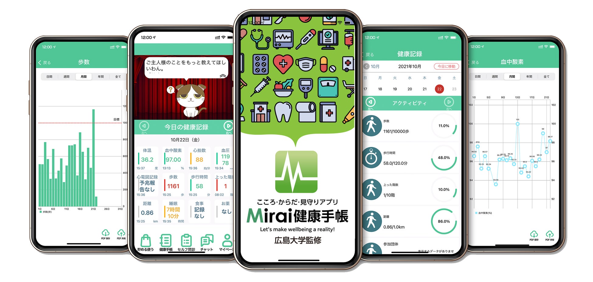みらい健康手帳は、「精神的価値が成長する感性イノベーション拠点(感性COI拠点)※1」(現在のBMKセンター)が、病院・研究・管理部門など全学の様々な部門と連携して、開発に取り組んでいる総合健康アプリです。本アプリは「ひろしまサンドボックス事業」で取り組んだ「みらい健幸アプリ」をリニューアルし、令和4(2022)年1月にリリースしました。