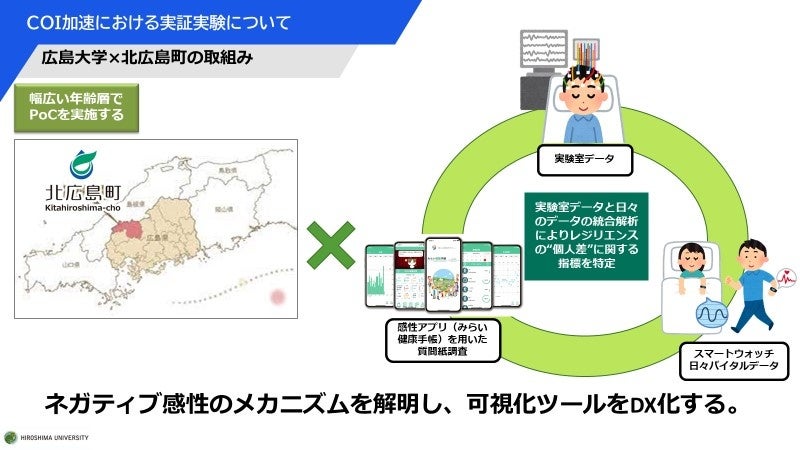 国立大学法人広島大学(学長:越智光夫)脳・こころ・感性科学研究センター(BMKセンター)の笹岡貴史准教授を中心とするグループは、北広島町(町長:箕野博司)の全面協力のもと、同町にて「感性可視化によるメンタルヘルスDX」実現のための実証実験を開始します。