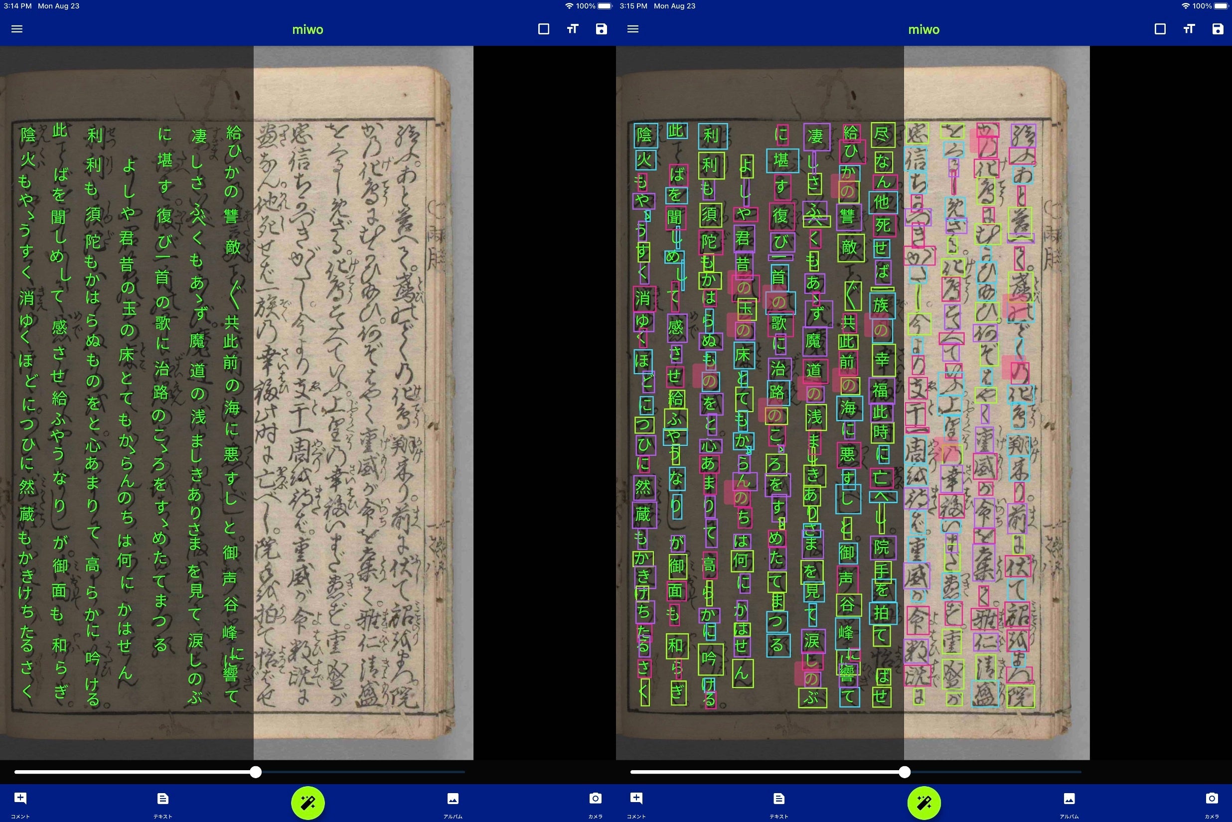 1. カメラ撮影画像の上にくずし字と現代日本語の文字を並べて表示することで、資料の内容を素早く確認できるようにしました。くずし字資料画像と現代日本語の文字表示とは、比較スライダーで切り替えられます。また文字を囲む四角形を表示することで、続けて書かれるくずし字(連綿体)の切れ目がどこにあるかも見えるようにしました。