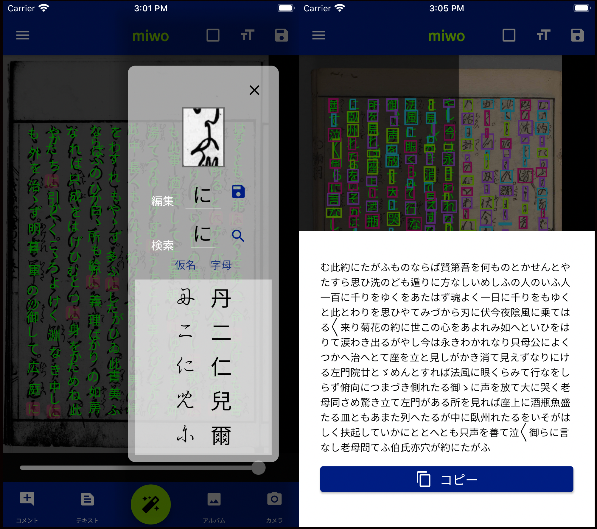 2. アプリ利用者がAIくずし字認識結果を修正できるようにしました。AIの認識結果が適切ではないと思う場合、利用者がROIS-DS CODHの「くずし字データセット」を参照して判断し、AIの認識結果を修正することで、より信頼性の高いテキストデータを作成できます。アプリの支援により、利用者がくずし字を読む能力も向上します。