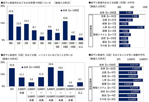また、部下に飲食代(1回)をおごる際、いくらくらいおごることが多いか聞いたところ、「0円」(22.8%)や「5,000円~10,000円未満」(24.0%)、「10,000円~15,000円未満」(19.5%)などに回答が集まり、平均は5,077円でした。