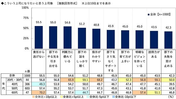 年代別にみると、20代・30代では「指示がわかりやすい」(68.2%)、40代では「判断力に優れている」(54.2%)、50代と60代では「責任から逃げない」(順に57.4%、70.2%)が1位でした。