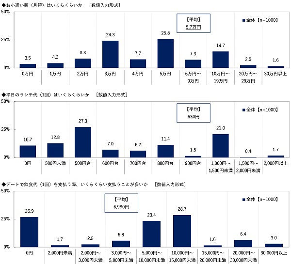 また、デートで飲食代(1回)を支払う際、いくらくらい支払うことが多いか聞いたところ、「0円」(26.9%)や「5,000円~10,000円未満」(23.4%)、「10,000円~15,000円未満」(28.7%)に回答が分かれ、平均は6,980円でした。