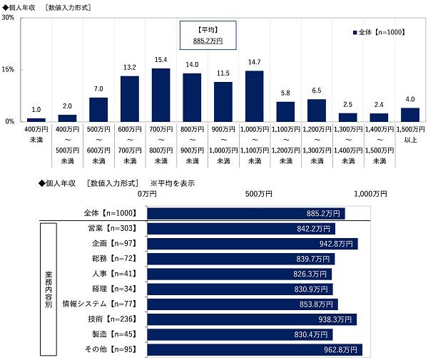 業務内容別にみると、個人年収の平均は、企画(942.8万円)が最も高くなり、技術(938.3万円)、情報システム(853.8万円)、営業(842.2万円)、総務(839.7万円)が続きました。